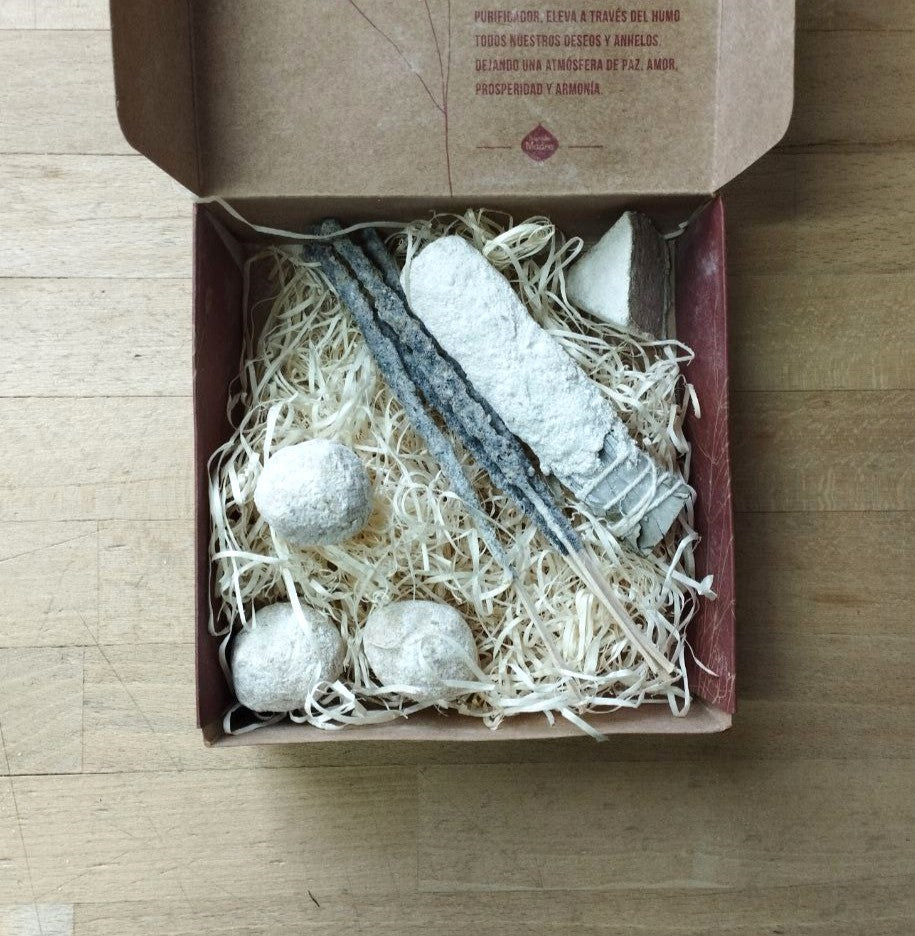 Wunderschönes Kräuter- Räucherset bestehend aus vier Räucherstäbchen Weißer Weihrauch, einer Räucherpyramide Yarga & Weihrauch, drei Copal Räucherkugeln und einem Kräuterbund Weißer Weihrauch.