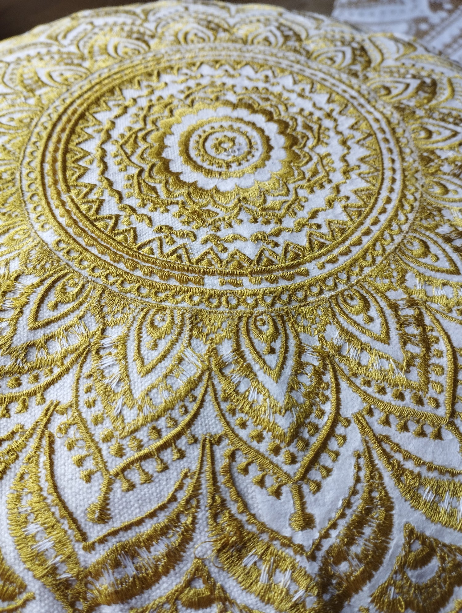 Yogakissen mit aufgesticktem Ombre Mandala in Gold. Leider wurde die Oberseite mit dem Stickmuster falsch herum aufgenäht, sodass die Unterseite nach Oben zeigt (siehe . Die ist allerdings nur bei genauerer Betrachtung zu erkennen und das Ombre Mandala ist trotzdem sehr gut zuerkennen. Gefüllt ist das Yogakissen mit Buchweizen.