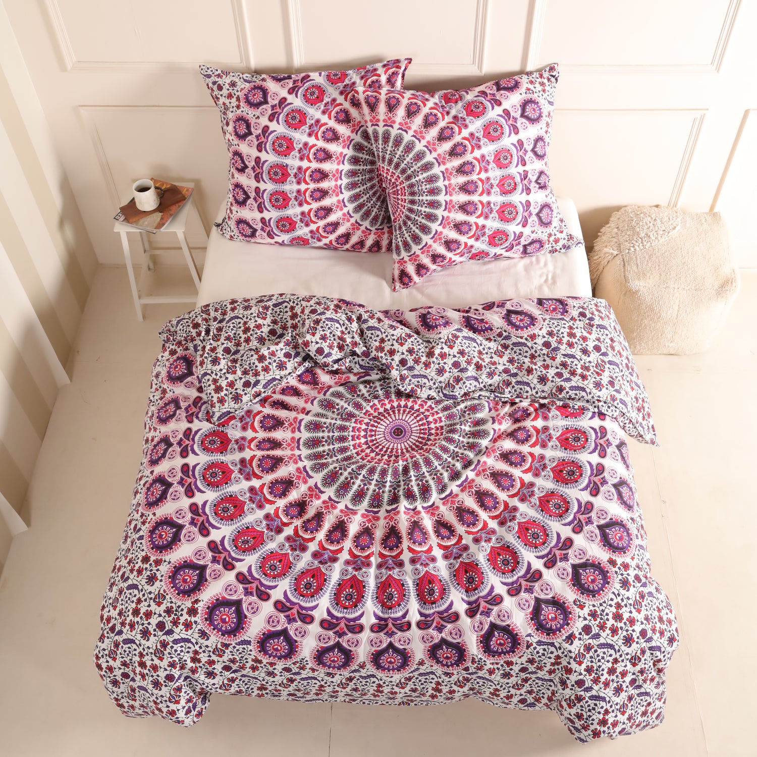 Der helle Grundton passt gut zu Naturfarben, Holz und hellen Möbeln. Besonders harmonisch wirkt die Bettwäsche zusammen mit passenden Vorhängen, Kissen oder Wandtüchern im Mandala Stil. So entsteht ein stimmiges Gesamtbild, das Ruhe ausstrahlt und gleichzeitig Persönlichkeit zeigt.