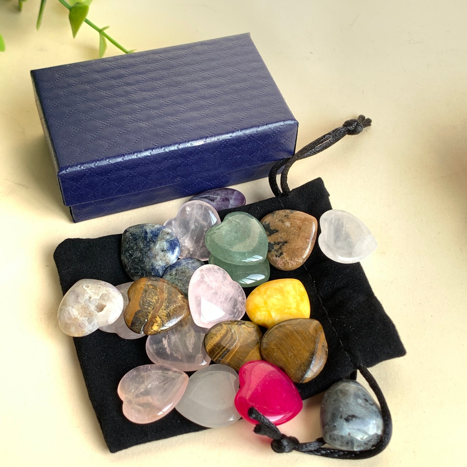 Die Herz-Kollektion enthält eine Mischung aus natürlichen Quarz- und Silikatmineralien, die sorgfältig in die symbolische Herzform geschliffen wurden.
