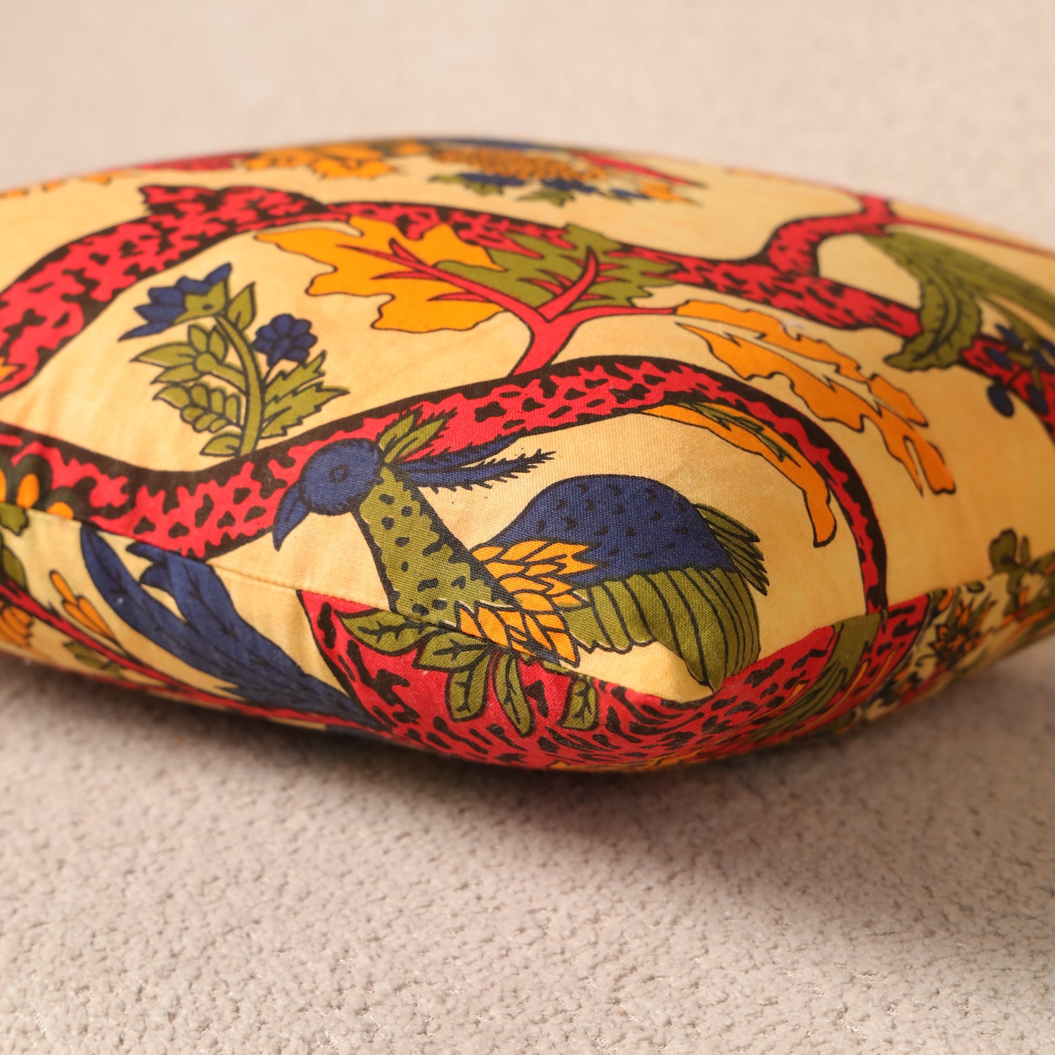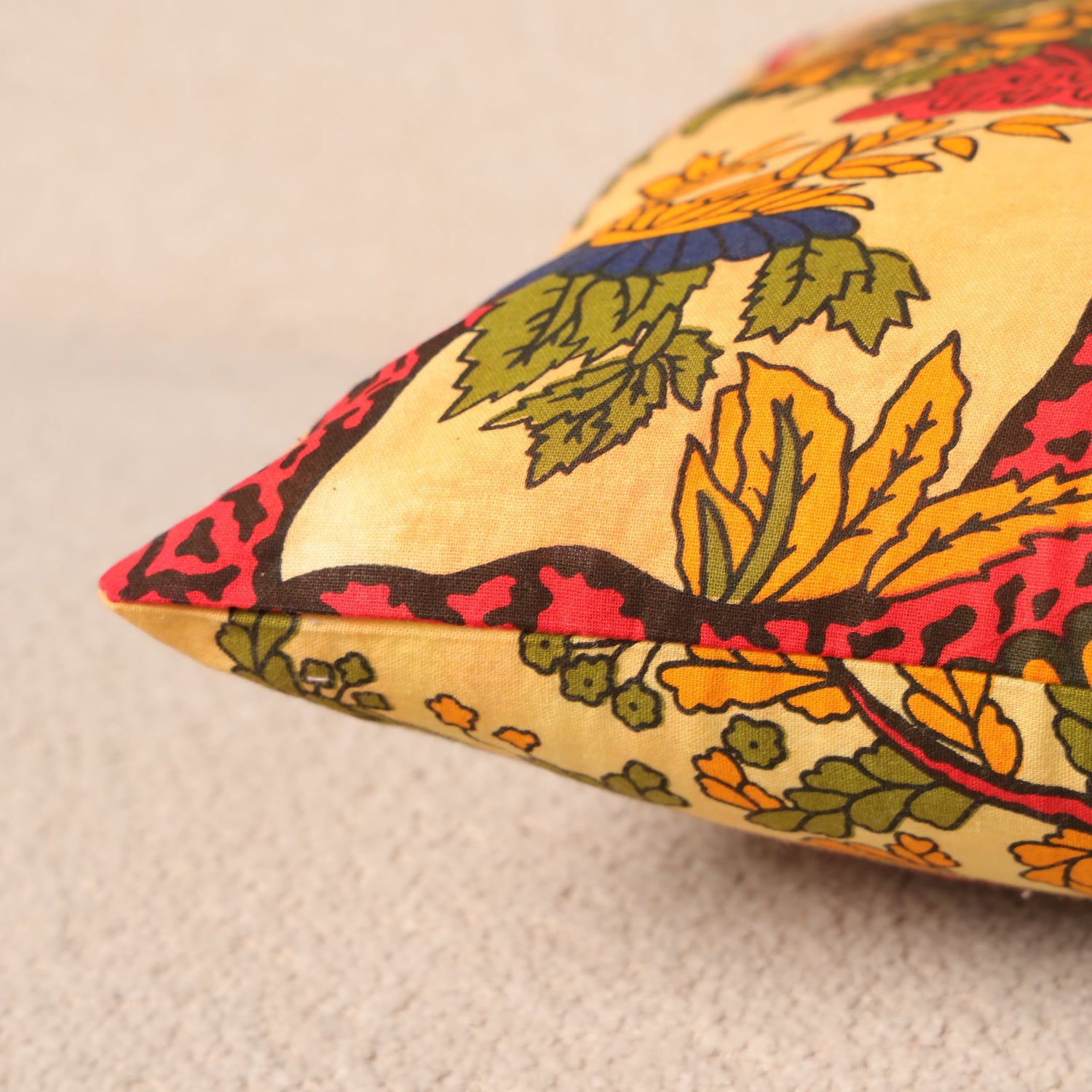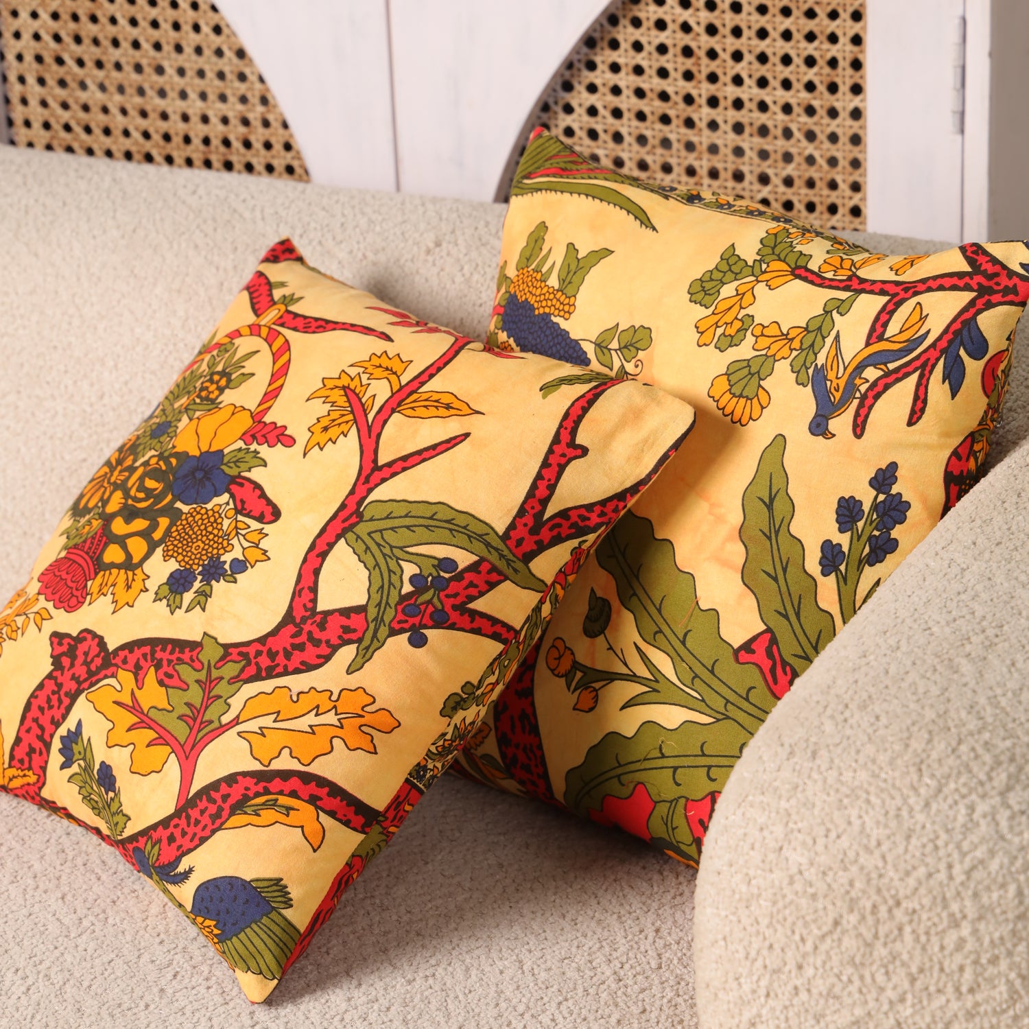 Dieses kunstvolle Lebensbaum Kissen bringt Symbolkraft, Wärme und Farbe in dein Zuhause. Im Mittelpunkt steht der traditionelle Lebensbaum, dessen geschwungene, rot gemusterte Äste sich kraftvoll über den Hintergrund ausbreiten. Umgeben wird das Motiv von detailreichen Blumen und Blättern, die für Wachstum, Harmonie und Verbundenheit mit der Natur stehen. Die ausbalancierte Farbwelt aus Goldgelb, Warmrot, Olivgrün und tiefem Blau verleiht dem Kissen eine lebendige und zugleich beruhigende Ausstrahlung.