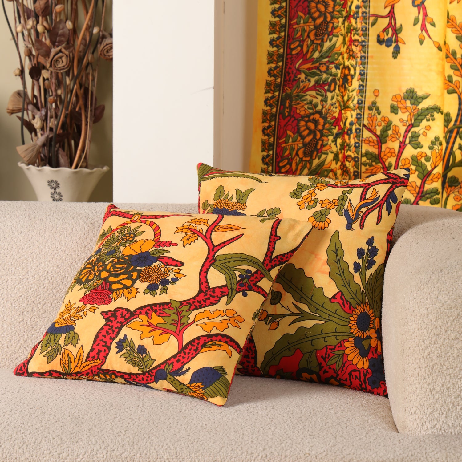 Der Lebensbaum Kissenbezug in Batik Orange verleiht jedem Raum eine warme, einladende Atmosphäre und fügt sich perfekt in verschiedene Einrichtungsstile ein. Ob auf dem Sofa, dem Bett oder in deiner Lieblingsleseecke – dieses Kissen bringt mit seinen leuchtenden Farben und dem natürlichen Design einen Hauch von Indien und Magie in dein Zuhause.