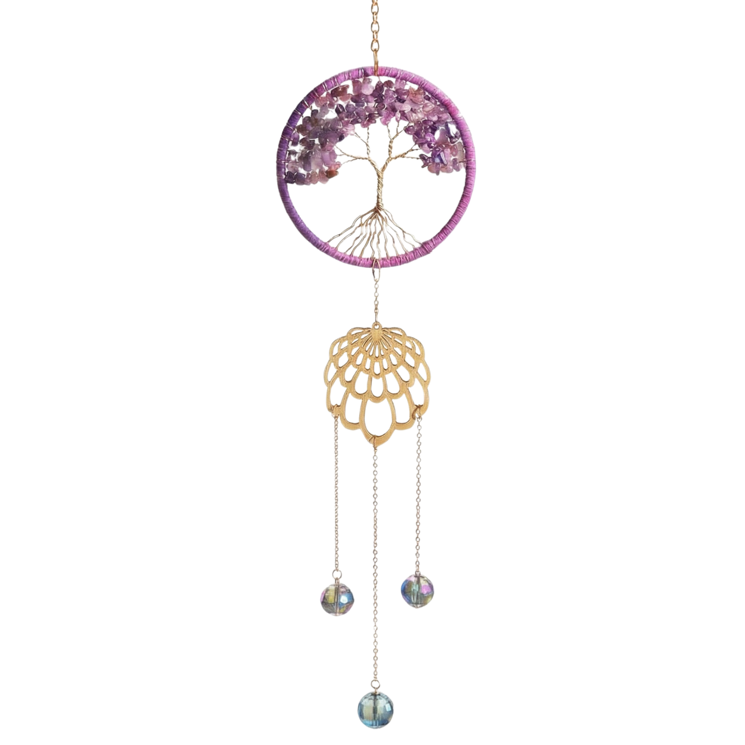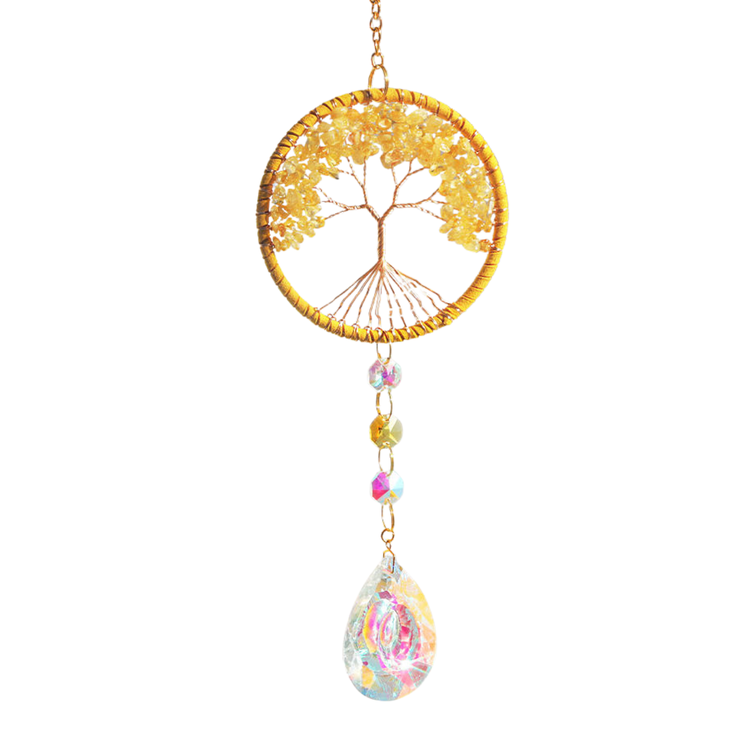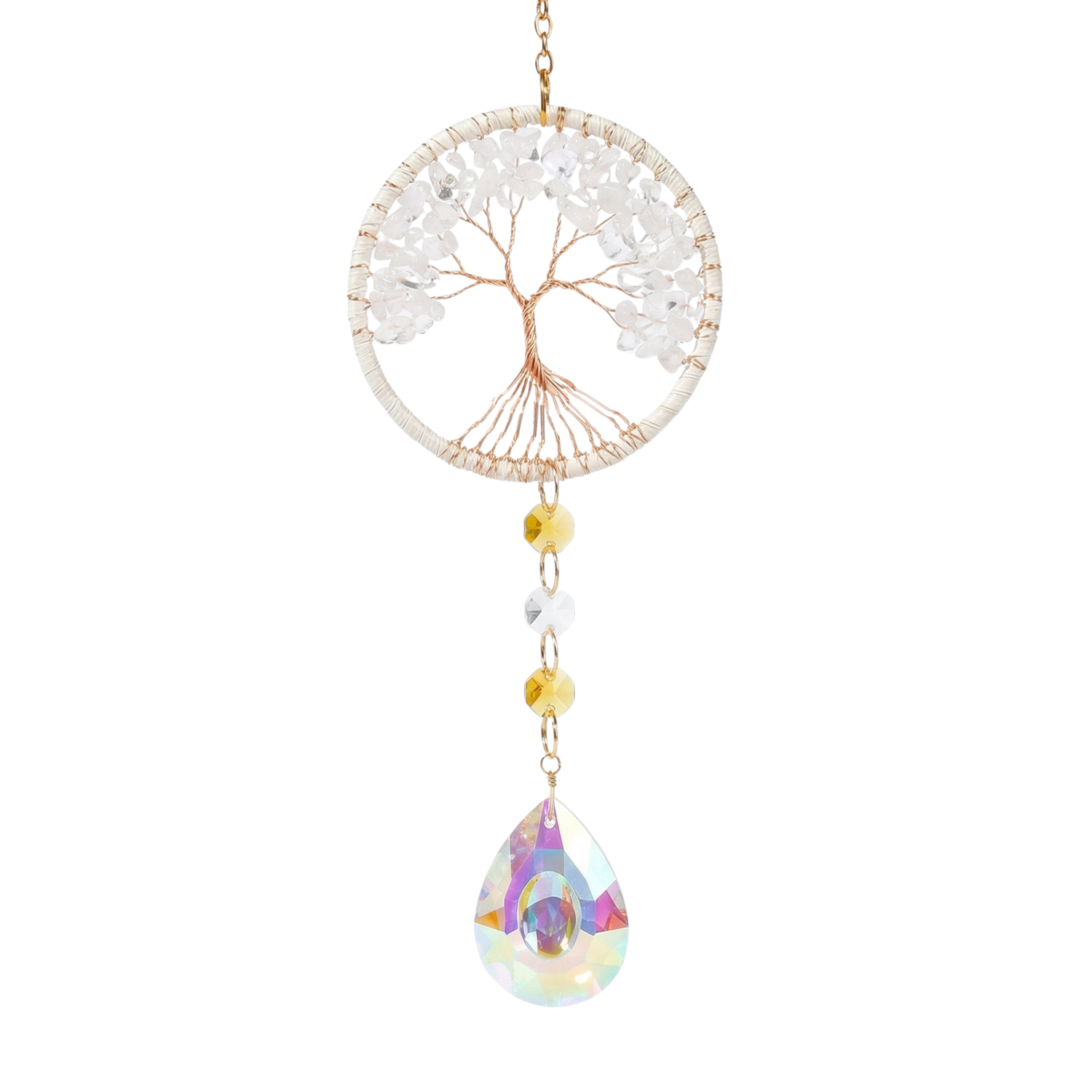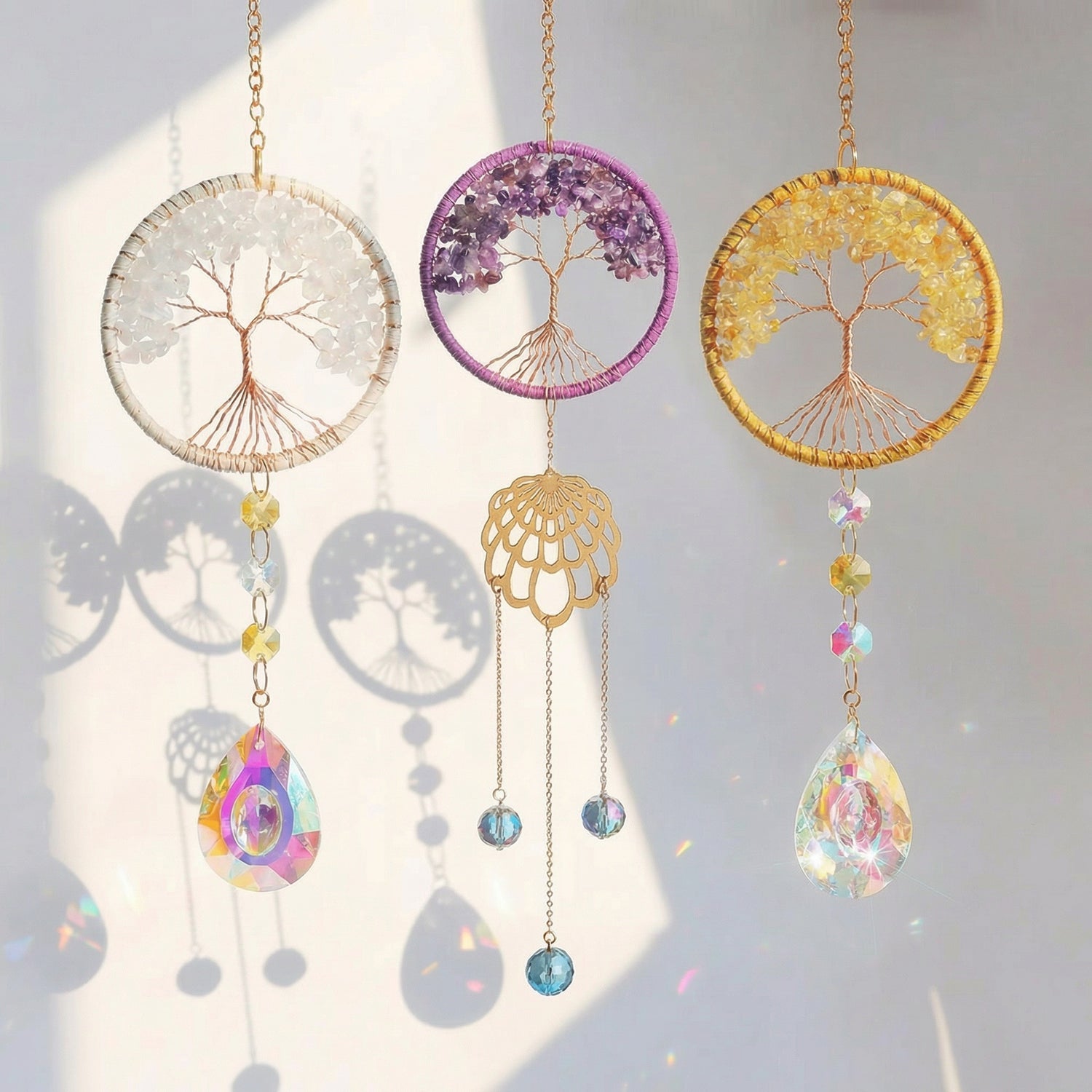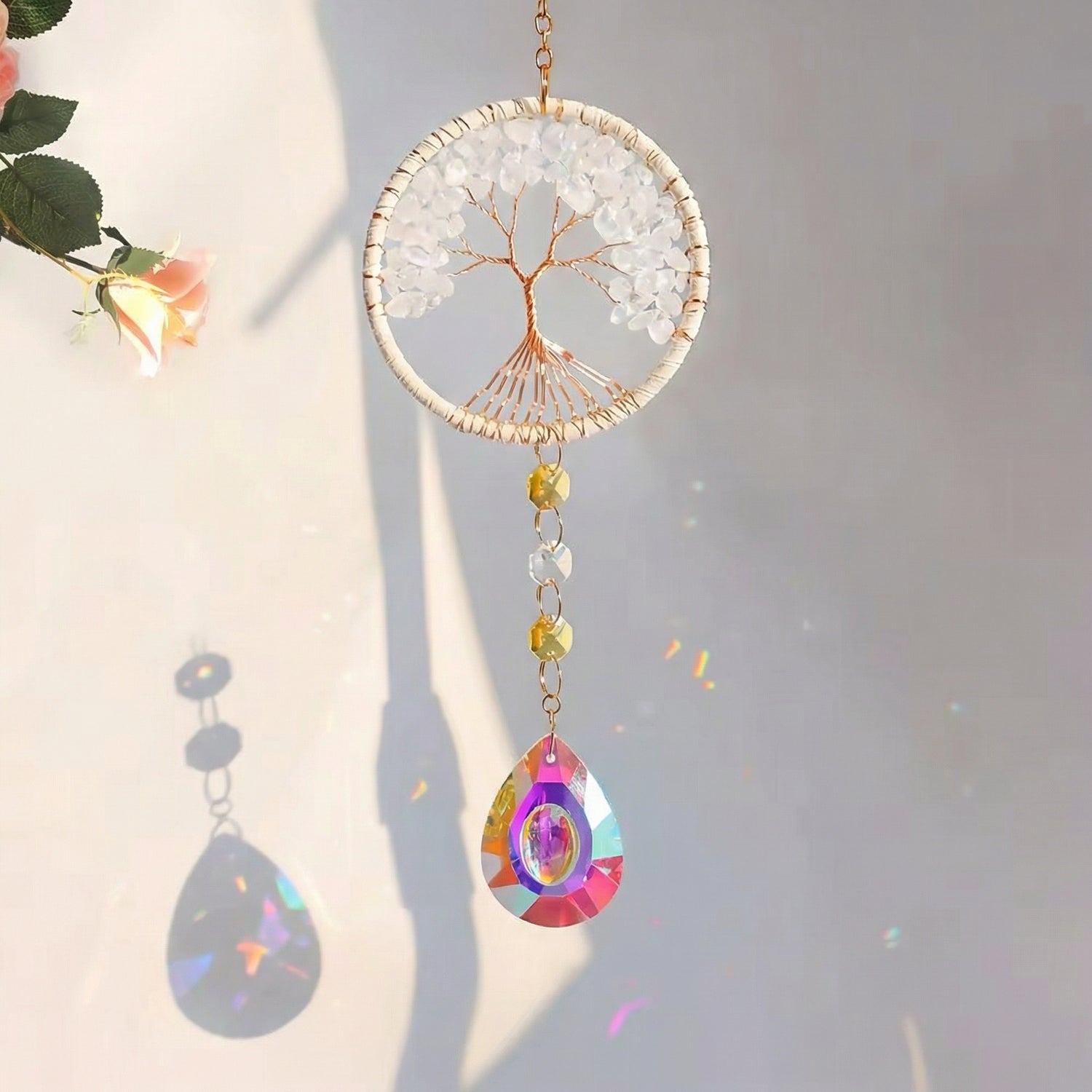 Dieser Sonnenfänger verbindet das kraftvolle Symbol des Lebensbaums mit funkelnden Lichtakzenten. Oben sitzt ein umwickelter Ring mit einem filigranen Baum aus Draht, dessen Krone aus echten Edelstein-Splittern besteht. Darunter ergänzt ein ornamentales Element das Design, an dem drei Kristallkugeln hängen. Sobald Sonnenlicht darauf trifft, entstehen sanfte Regenbogenreflexe, die Wände und Ecken mit kleinen Lichtpunkten beleben.
