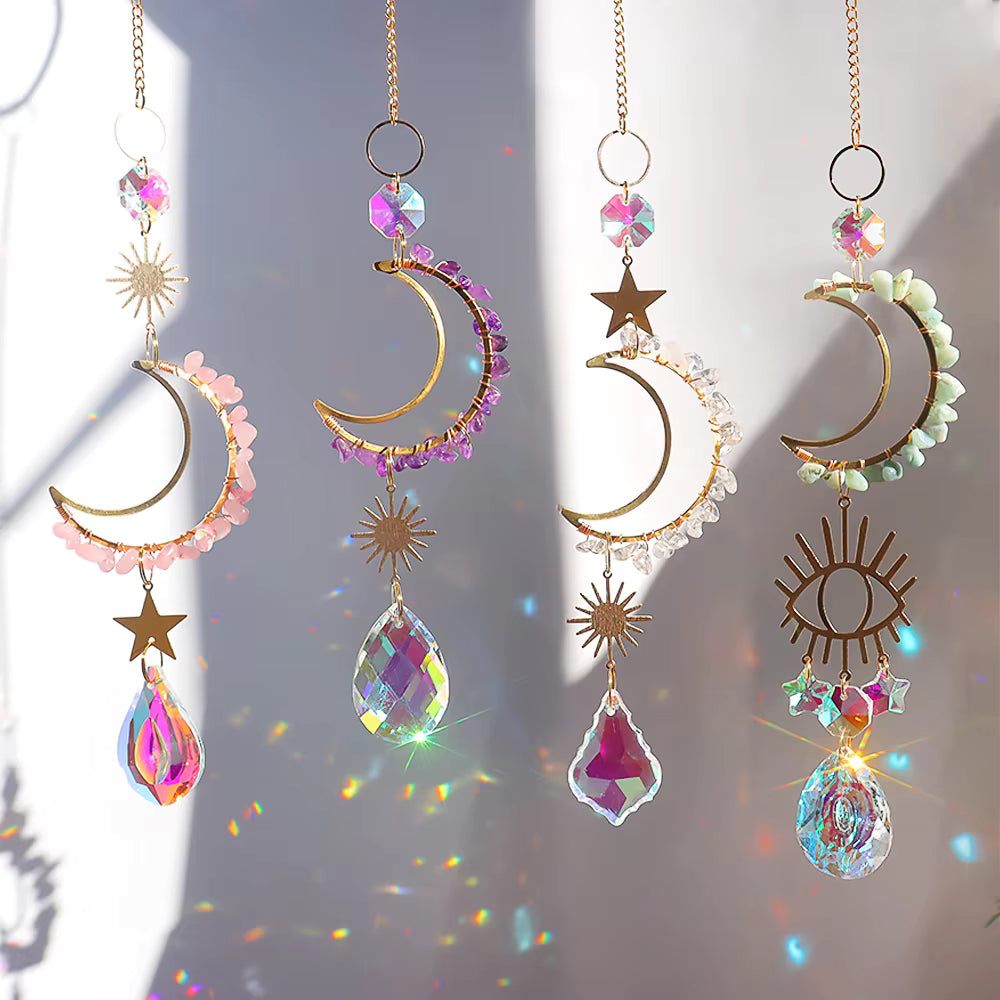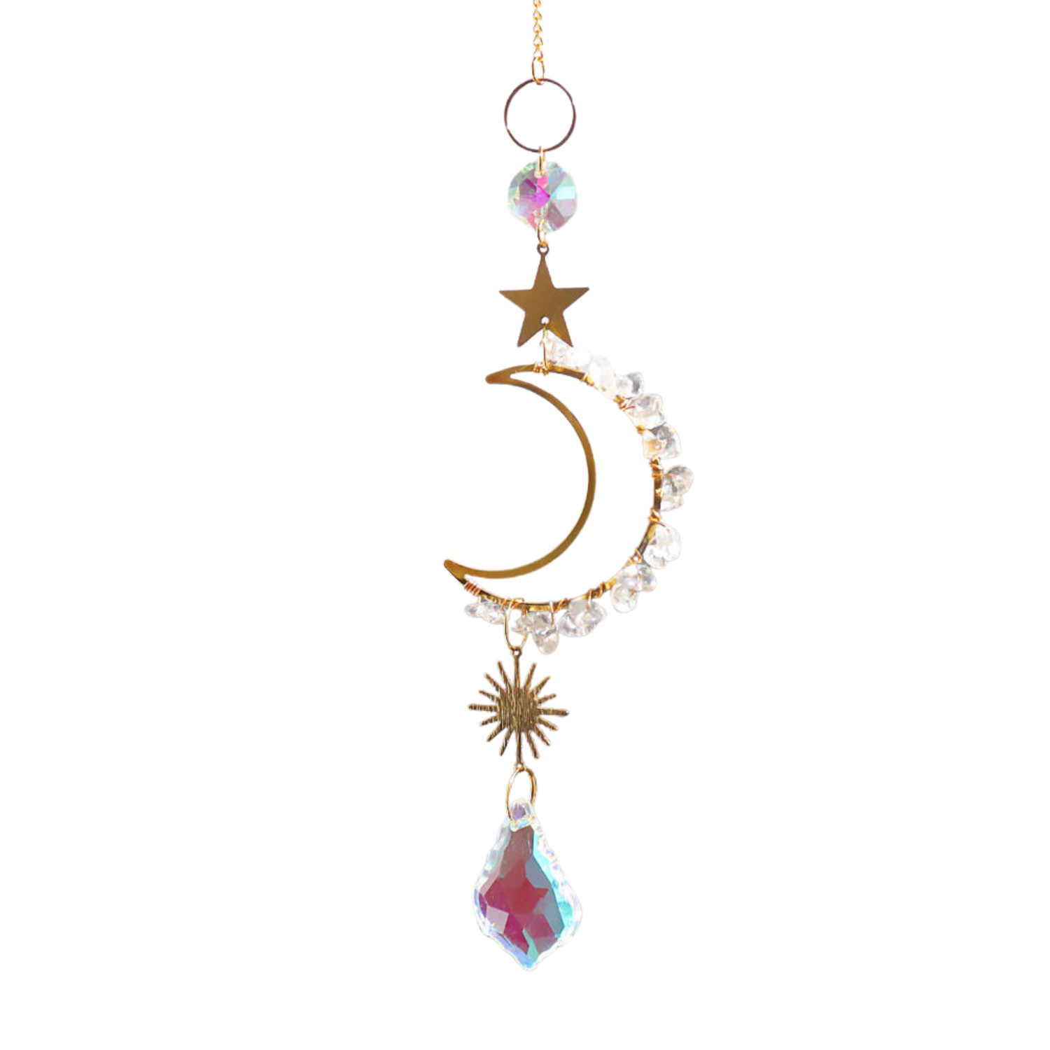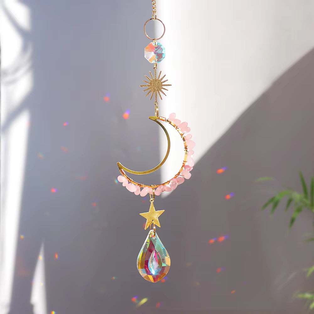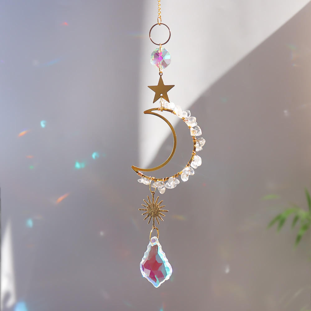 Dieser kleine Sonnenfänger bringt eine besondere Stimmung ans Fenster: Eine filigrane Mondsichel in Goldoptik ist mit feinen Edelstein-Splittern umwickelt. Darunter hängt ein kleines Sonnenstern-Element und als Abschluss ein großer Prismatropfen, der das Licht in sanfte Regenbogenreflexe verwandelt. Perfekt, wenn du dir einen dezenten Blickfang wünschst, der trotzdem sofort wirkt.