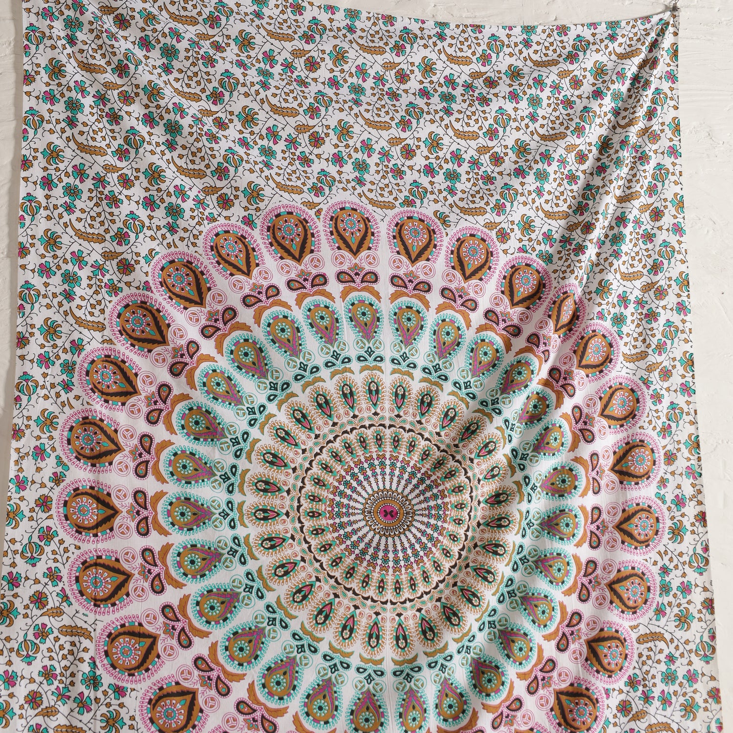 Dieses helle Wandtuch bringt Ruhe, Leichtigkeit und einen Hauch indischer Ornamentkunst in deinen Raum. Auf dem weißen Baumwollgrund entfaltet sich ein detailreicher Pfauenfeder Mandala Druck in Rosa, Lila und Türkis verspielt, harmonisch und zugleich ausdrucksstark. Perfekt, wenn du eine helle, freundliche Wandgestaltung suchst, die nicht laut ist, aber sofort Atmosphäre schafft.