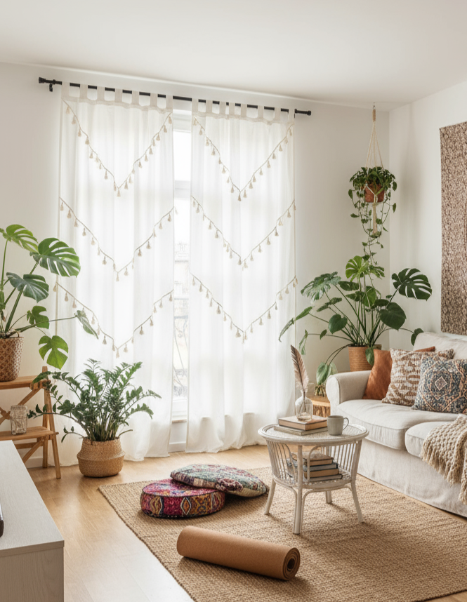 Nutze diesen Vorhang als stilvolle Fenster- oder Türdekoration, als luftige Raumtrennung oder als gemütlichen Hintergrund für deine Boho-Wandgestaltung. Besonders schön wirkt er in Kombination mit Holzmöbeln, Rattan-Deko oder warmen Erdtönen.