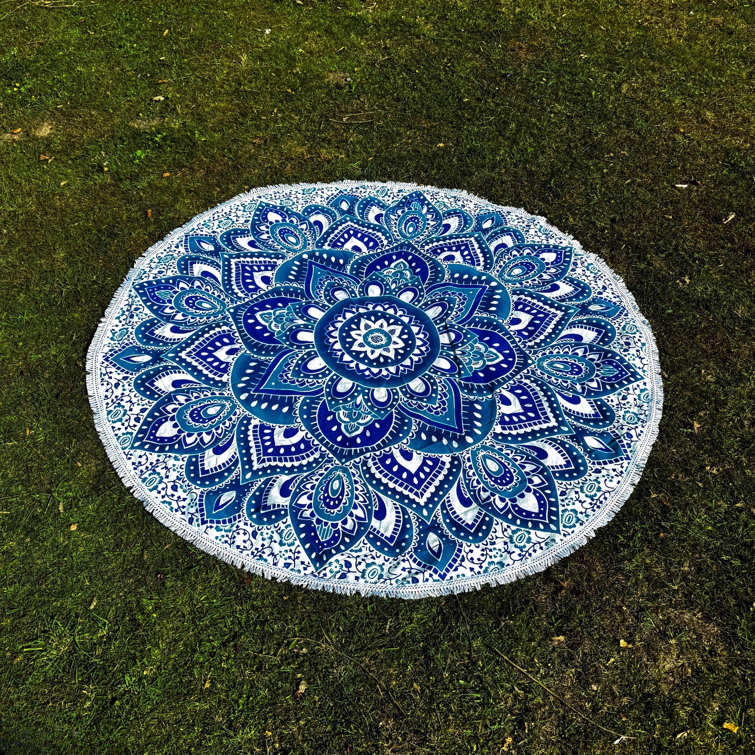 Unser rundes Mandala Tuch bietet genug Platz um mit 2-3 Personen zu sitzen oder sich zu zweit in den Park oder an den Strand zu legen.