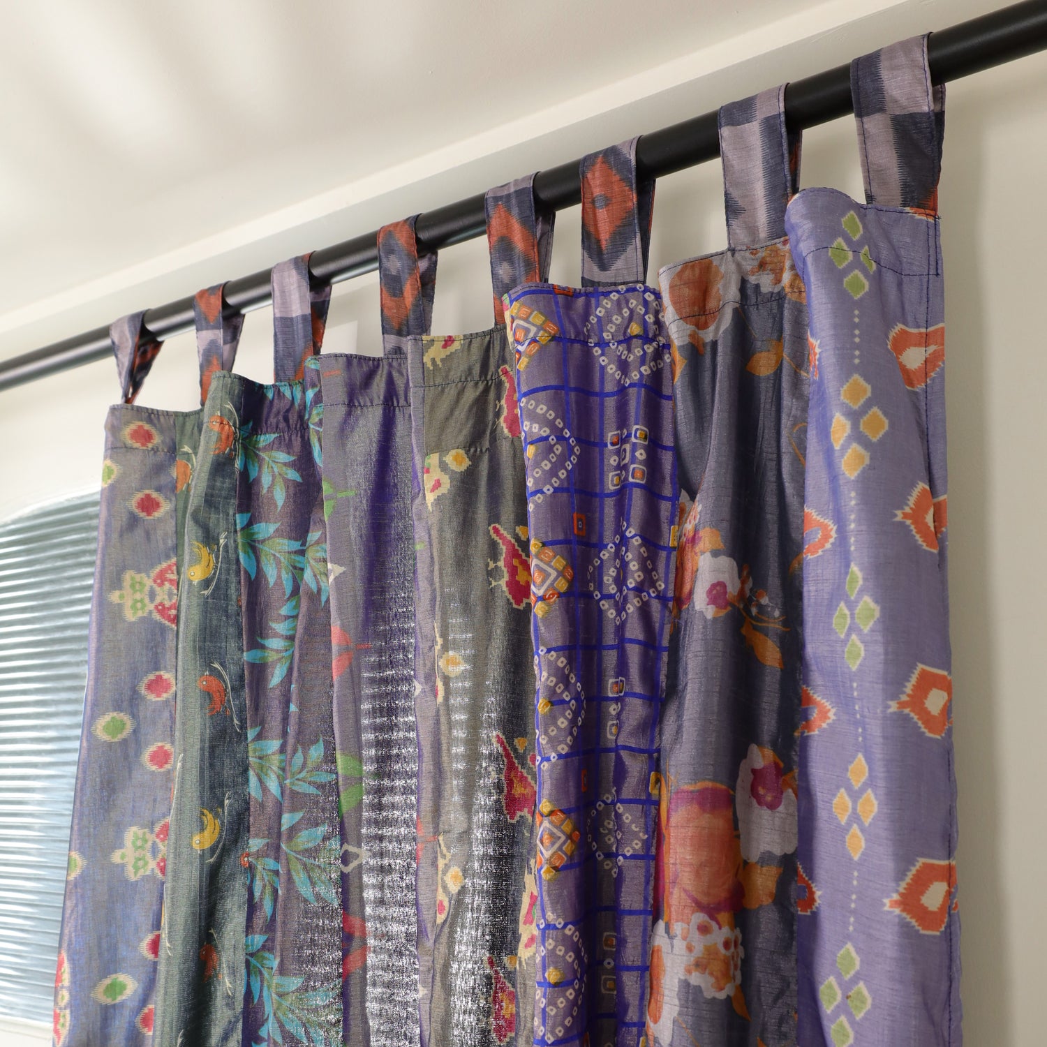 Unsere Sari-Vorhänge bestehen aus recycelter Kunstseide (Oberstoff) und Baumwolle (Rückseite).