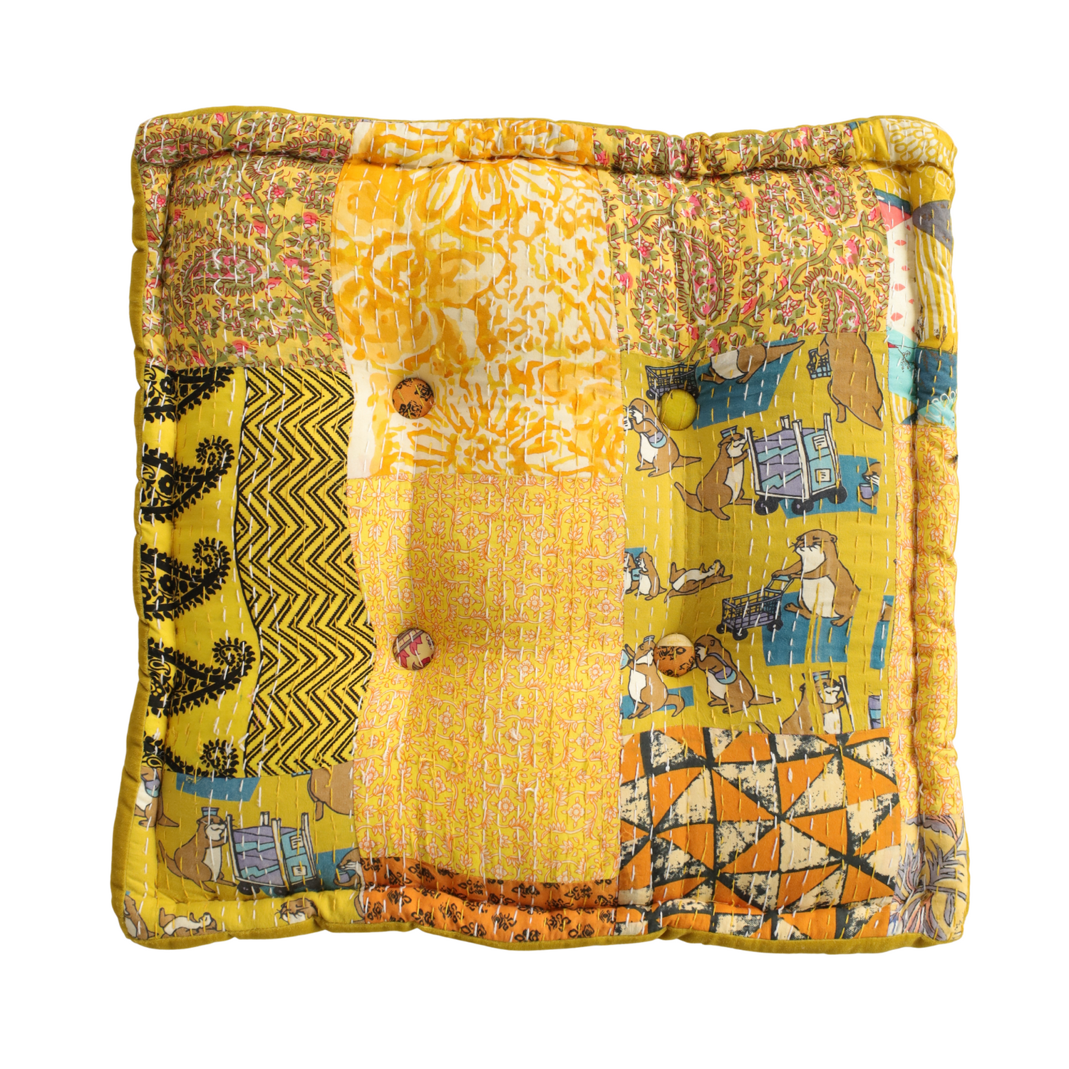 Bodenkissen im Kantha-Stil – Gelbes Sitzkissen, handgefertigt aus Indien