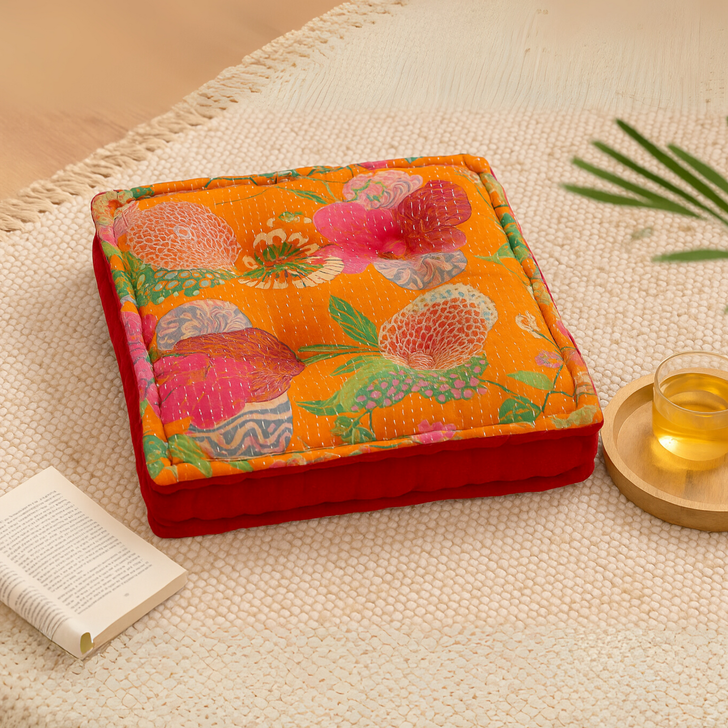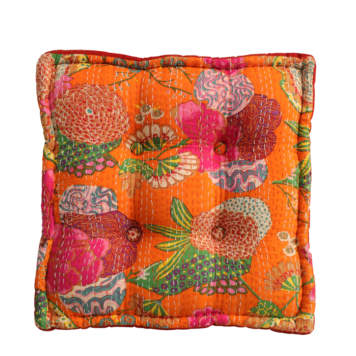 Bodenkissen im Kantha-Stil – Orangefarbenes Sitzkissen aus Indien