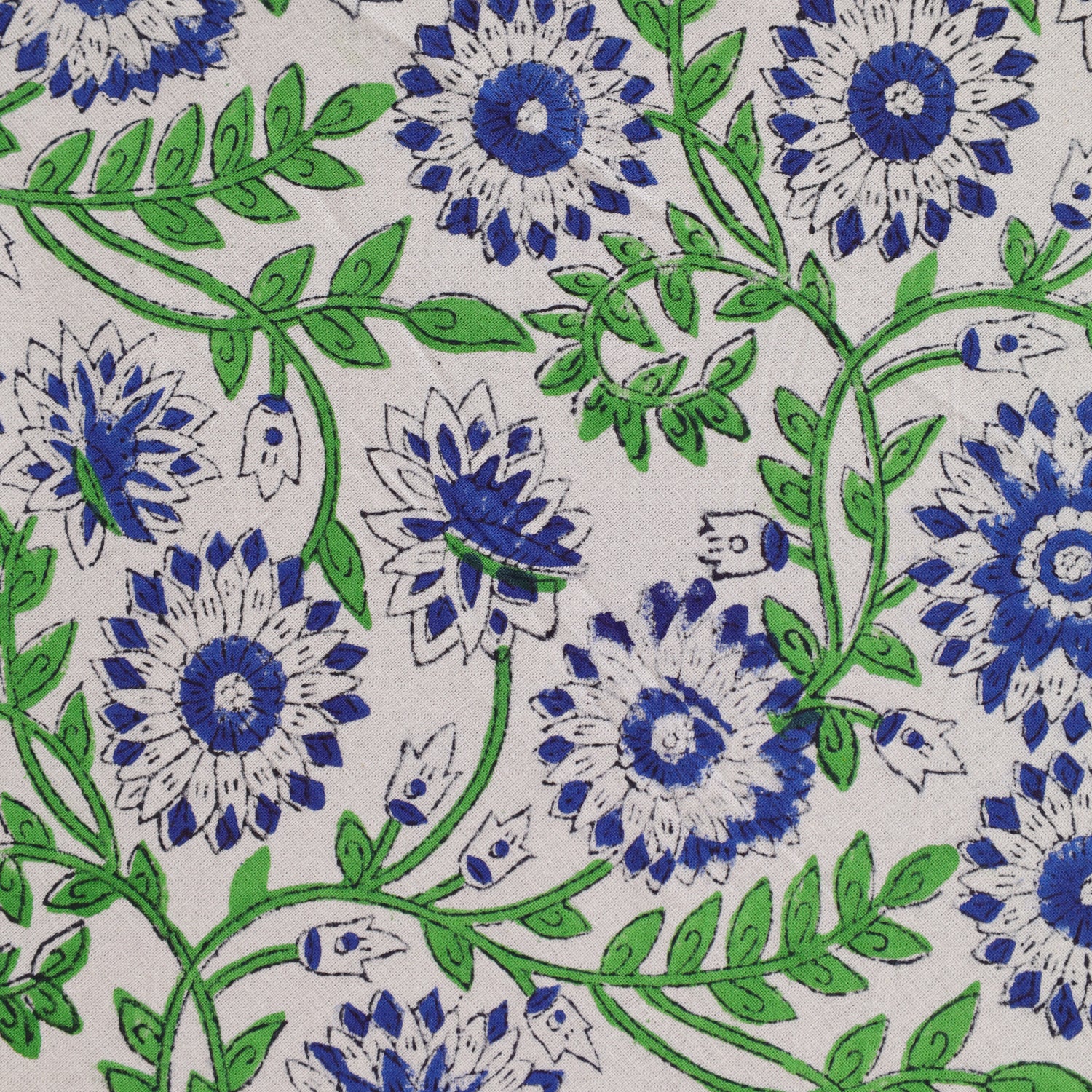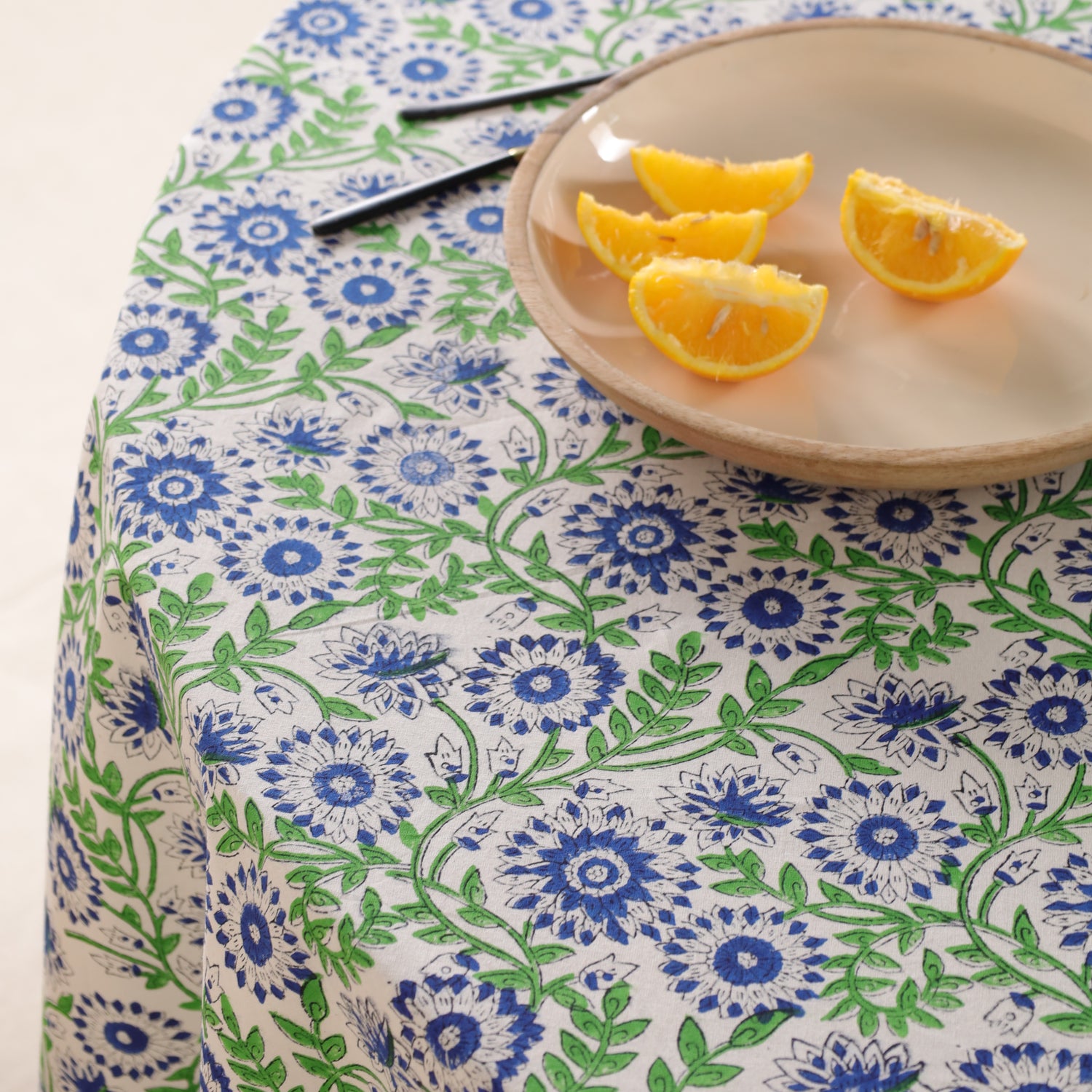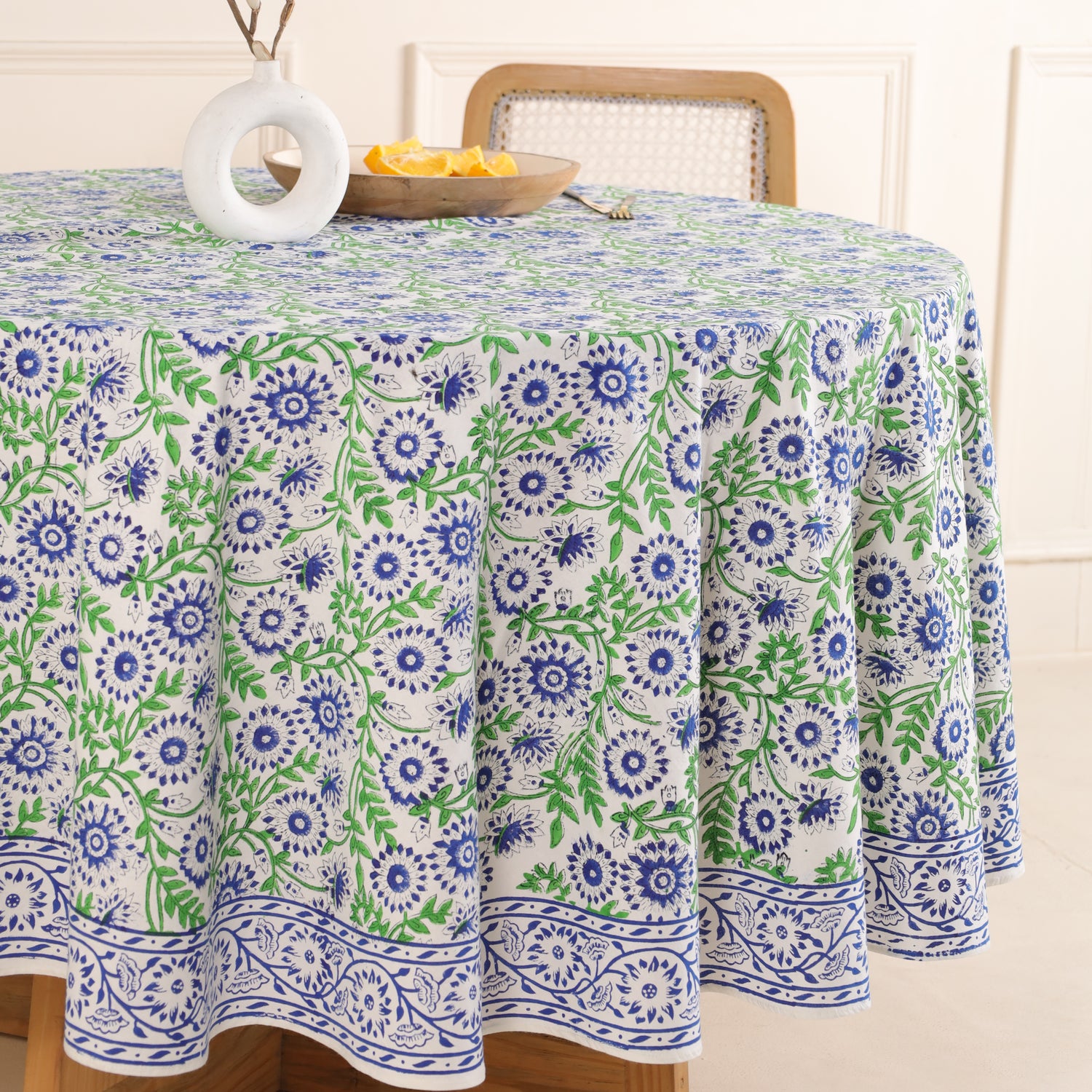 Diese runde Tischdecke bringt lebendige Natürlichkeit und indische Handwerkskunst direkt auf deinen Tisch. Das feine Rankenmuster in Blau und Grün wird per traditionellem Blockdruck auf reine Baumwolle aufgetragen – eine jahrhundertealte Technik, die bis heute in Rajasthan gepflegt wird. Jede Tischdecke ist ein Unikat und verbindet kunstvolles Design mit handwerklicher Authentizität.
