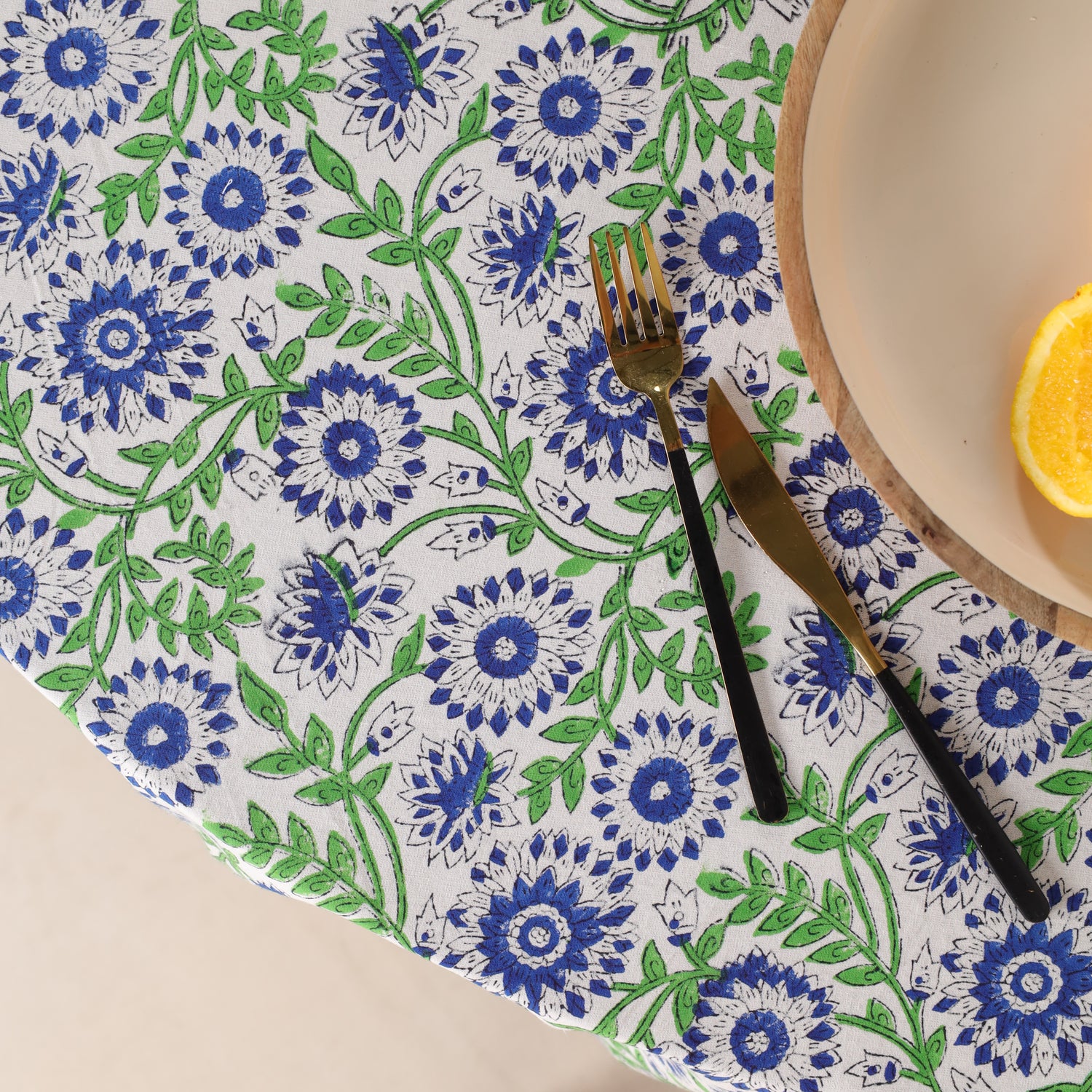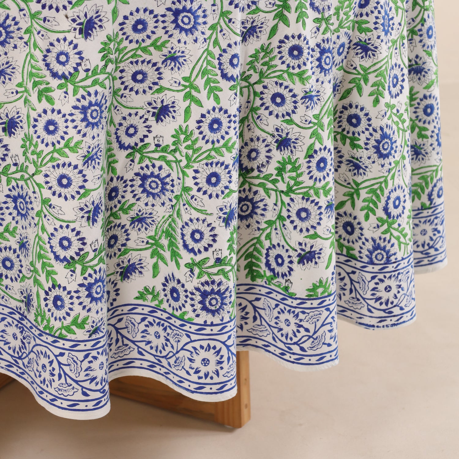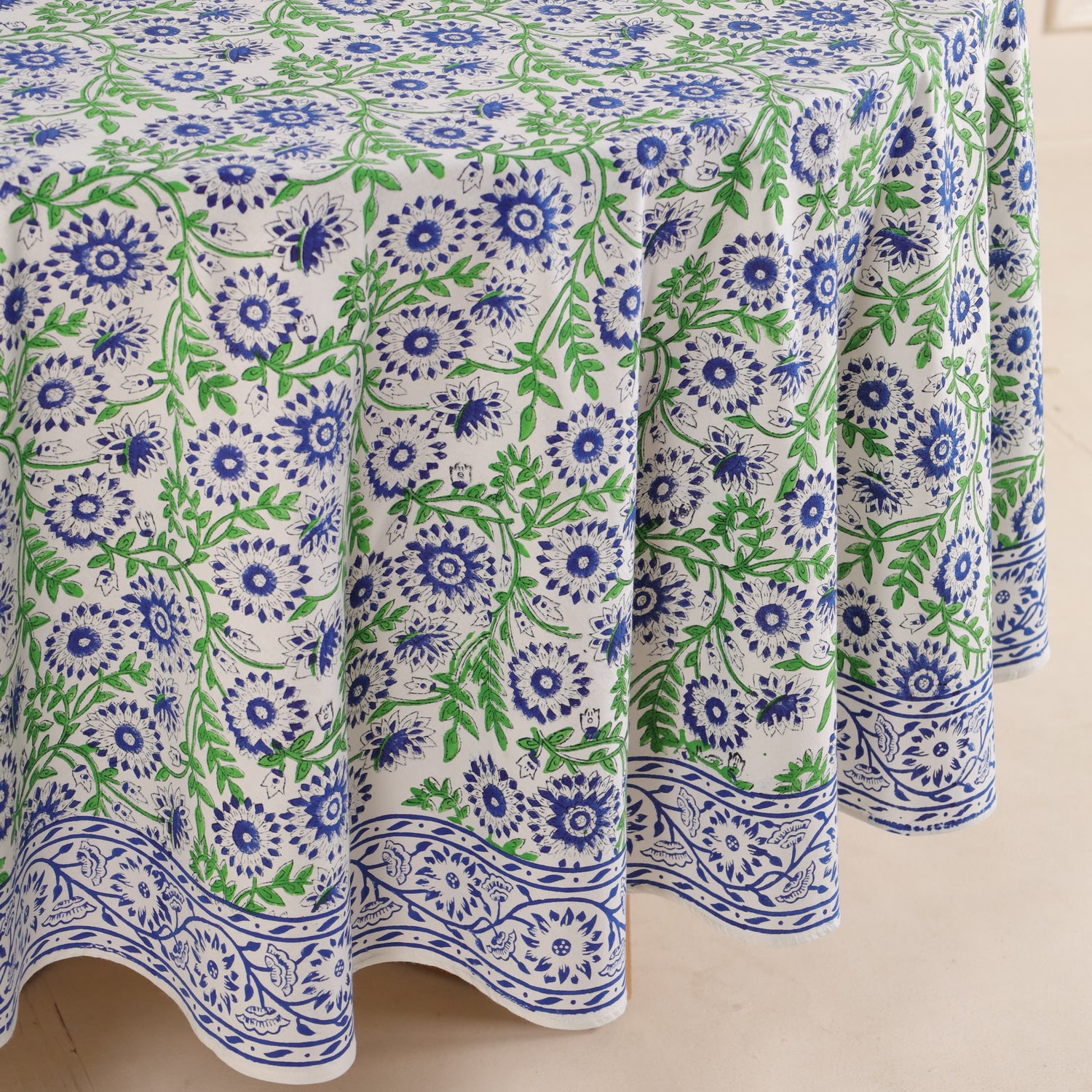 Runde Tischdecke aus Baumwolle mit indischem Blockdruck – Ranken in Blau und Grün