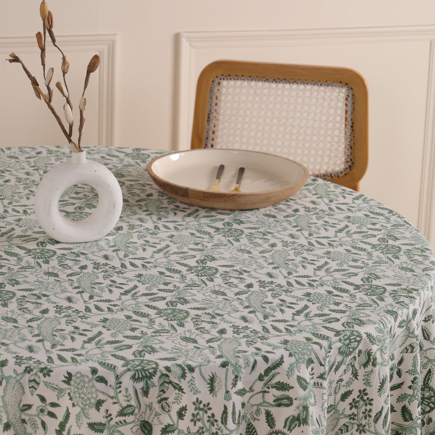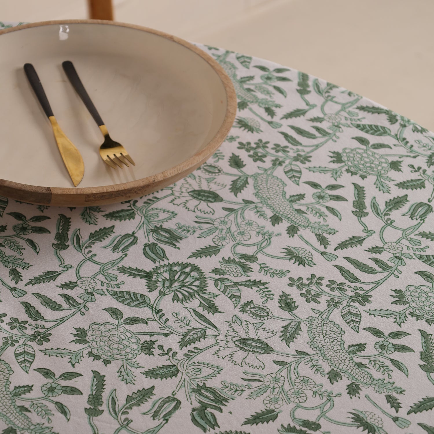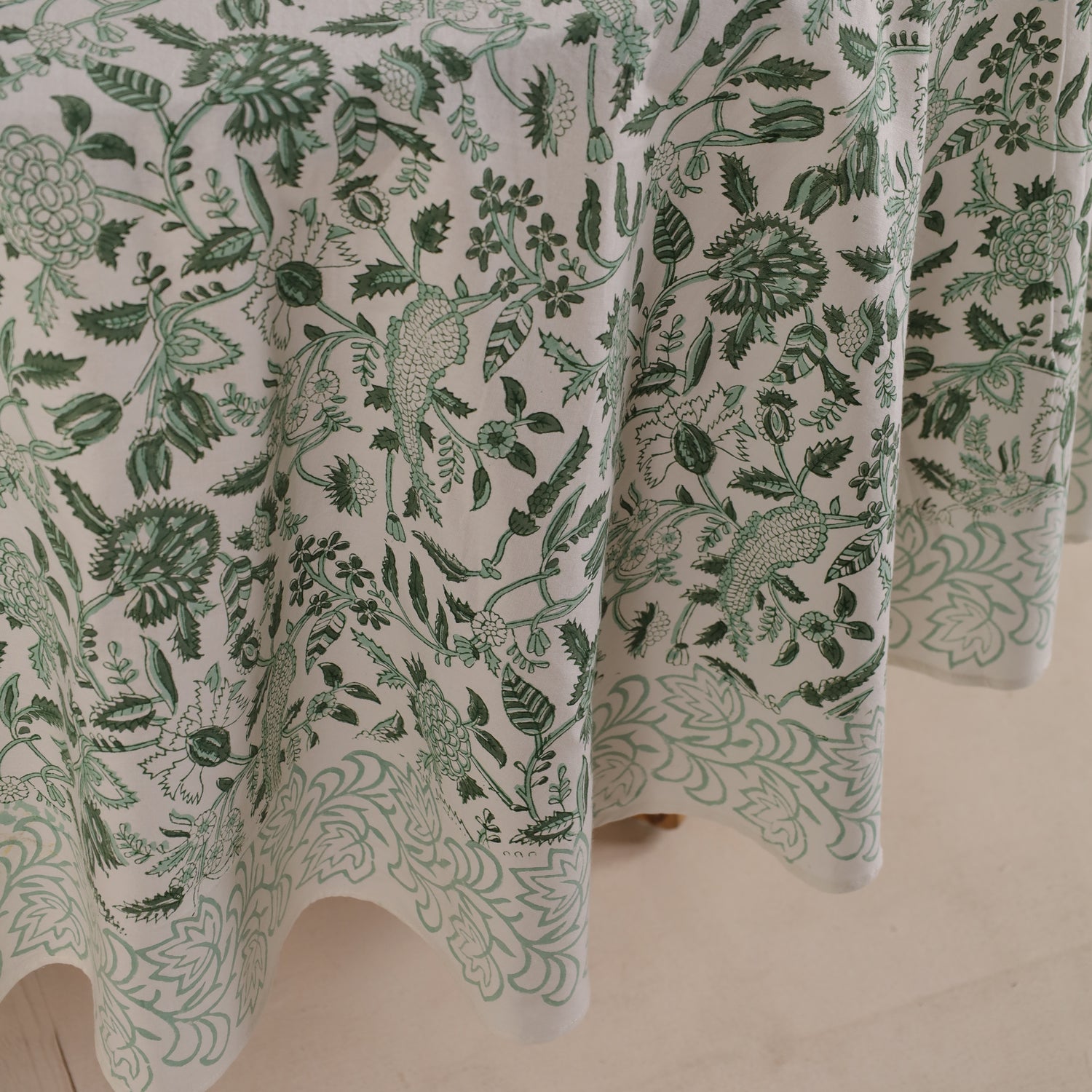 Runde Tischdecke aus Baumwolle mit indischem Blockdruck – Ranken in Grün