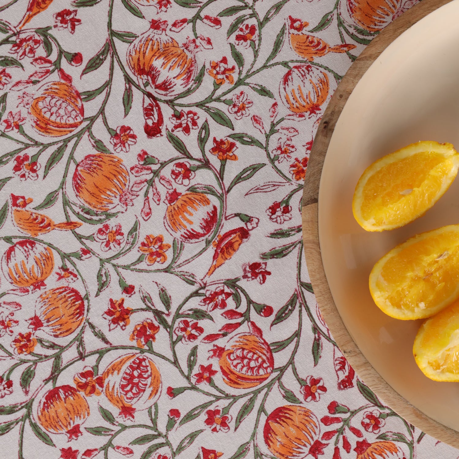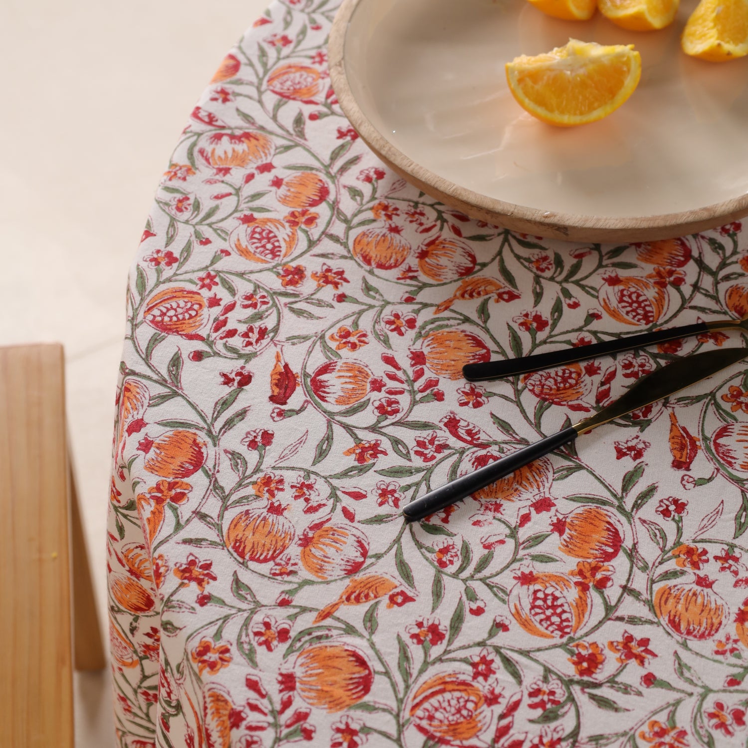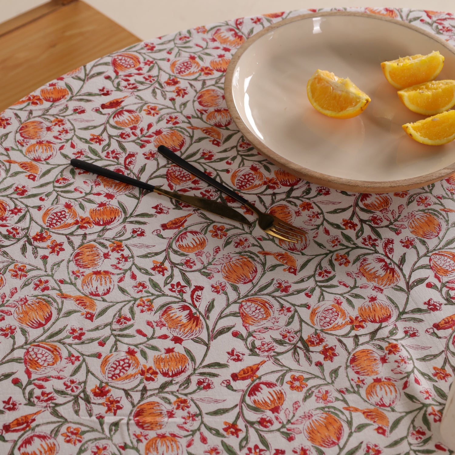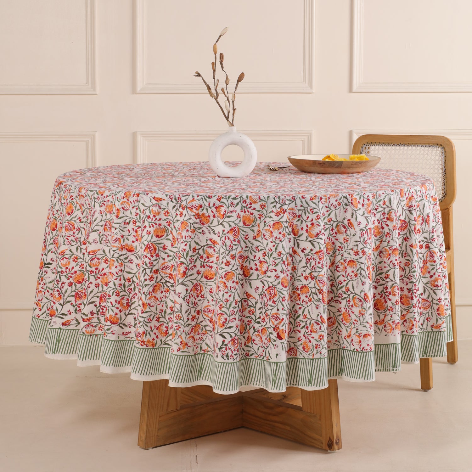 Diese runde Tischdecke bringt Lebendigkeit und Wärme auf deinen Tisch. Das Rankenmuster in Orange und Grün wird in traditioneller Blockdruck-Technik auf reine Baumwolle aufgetragen. Dieses jahrhundertealte Verfahren aus Rajasthan sorgt dafür, dass jede Tischdecke ein echtes Unikat ist – detailreich, handgefertigt und voller Charakter.