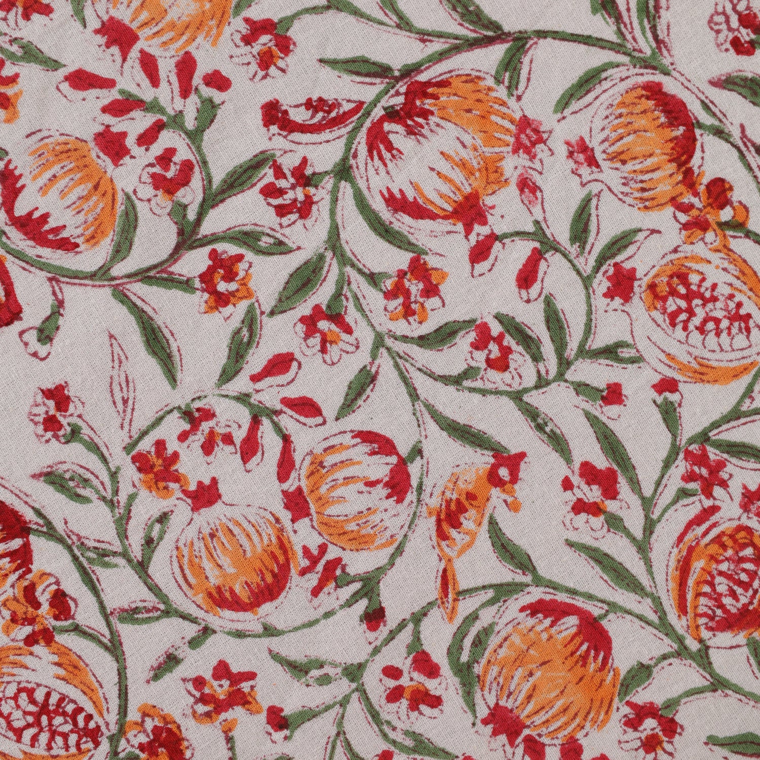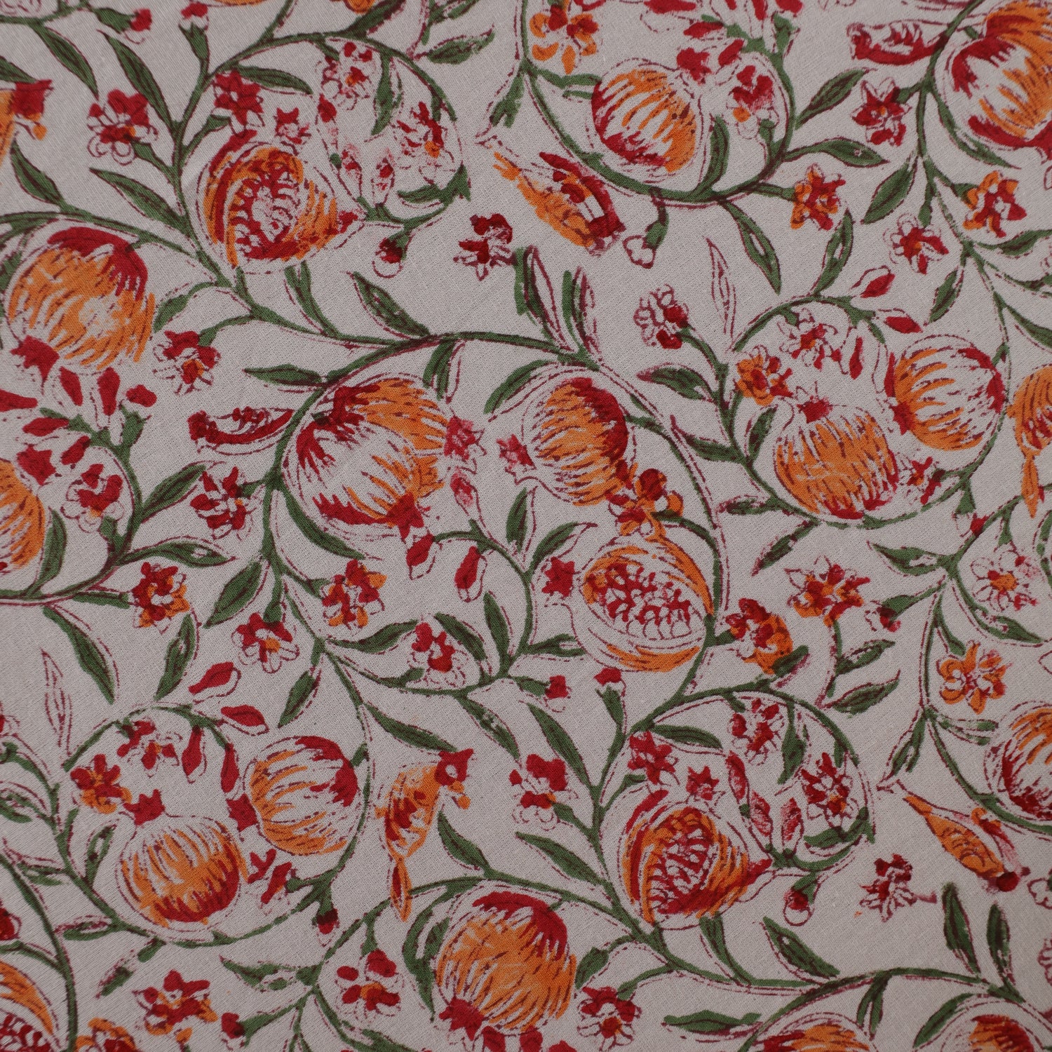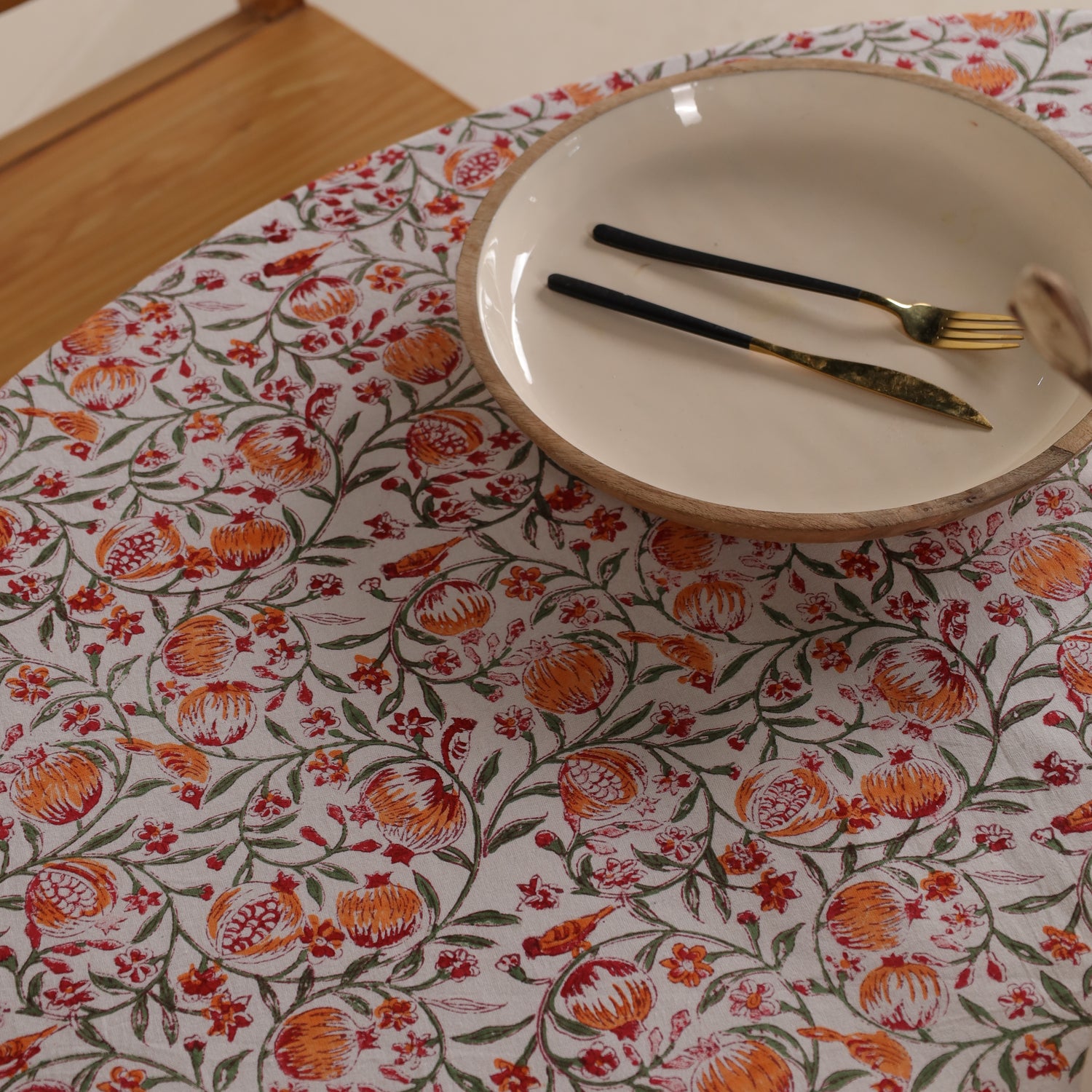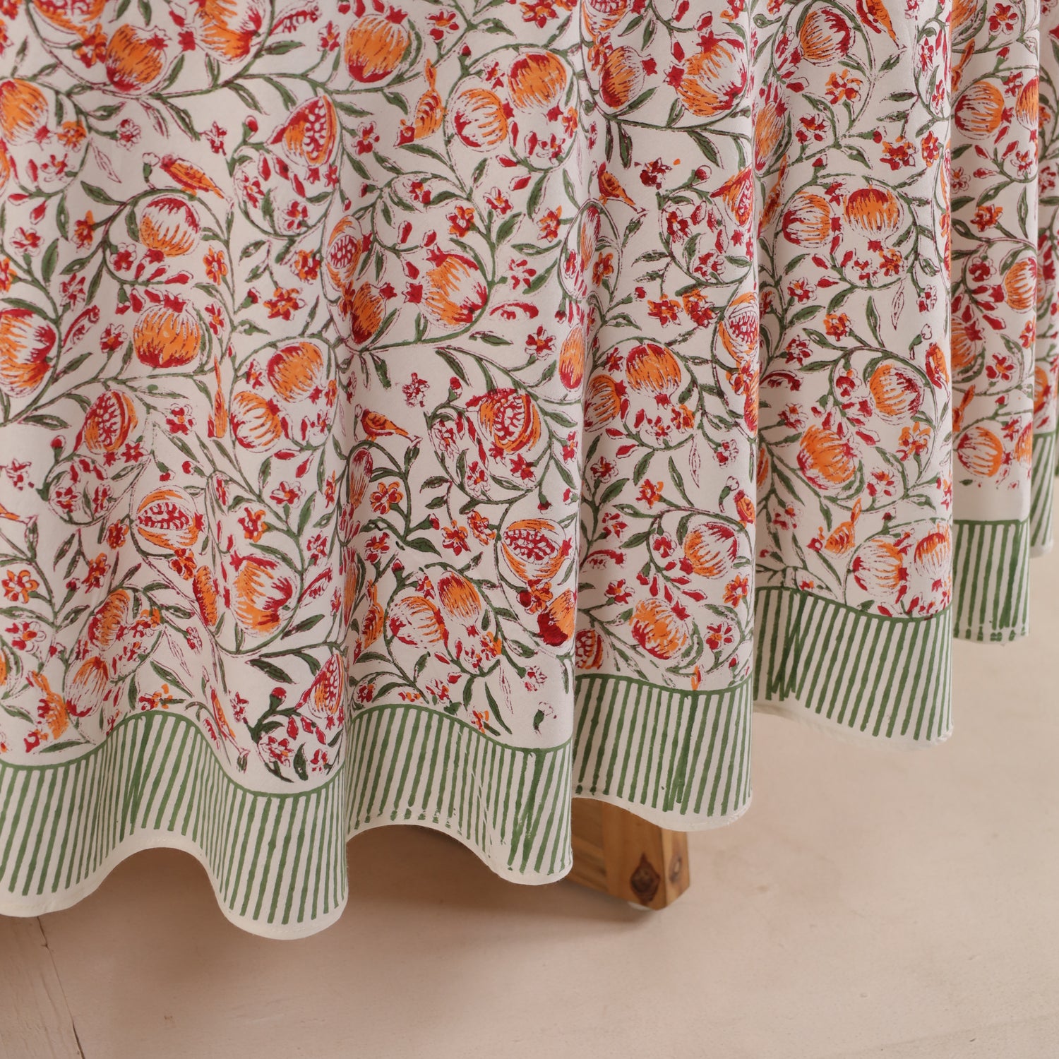 Diese runde Tischdecke bringt Lebendigkeit und Wärme auf deinen Tisch. Das Rankenmuster in Orange und Grün wird in traditioneller Blockdruck-Technik auf reine Baumwolle aufgetragen. Dieses jahrhundertealte Verfahren aus Rajasthan sorgt dafür, dass jede Tischdecke ein echtes Unikat ist – detailreich, handgefertigt und voller Charakter.