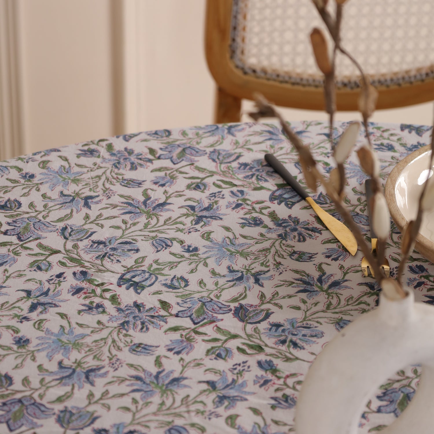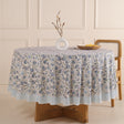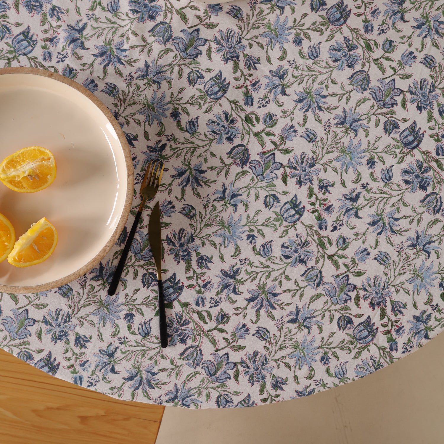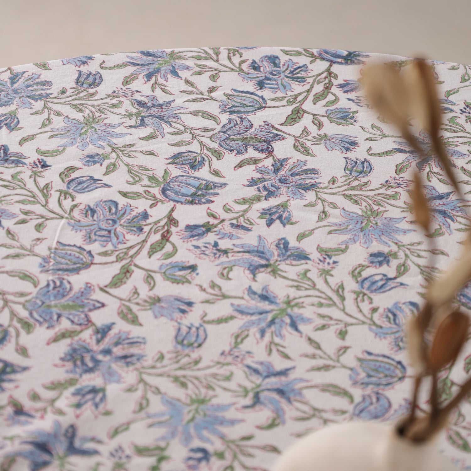 Runde Tischdecke aus Baumwolle mit indischem Blockdruck – Ranken in Weiß, Grün und Blau