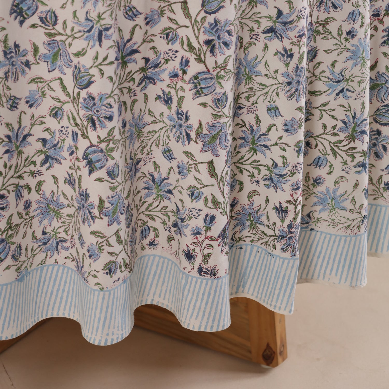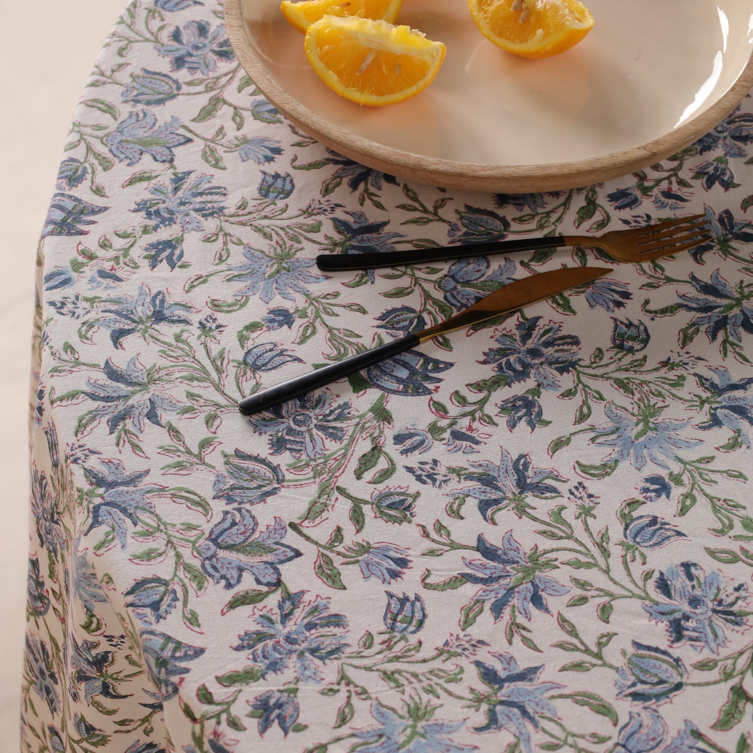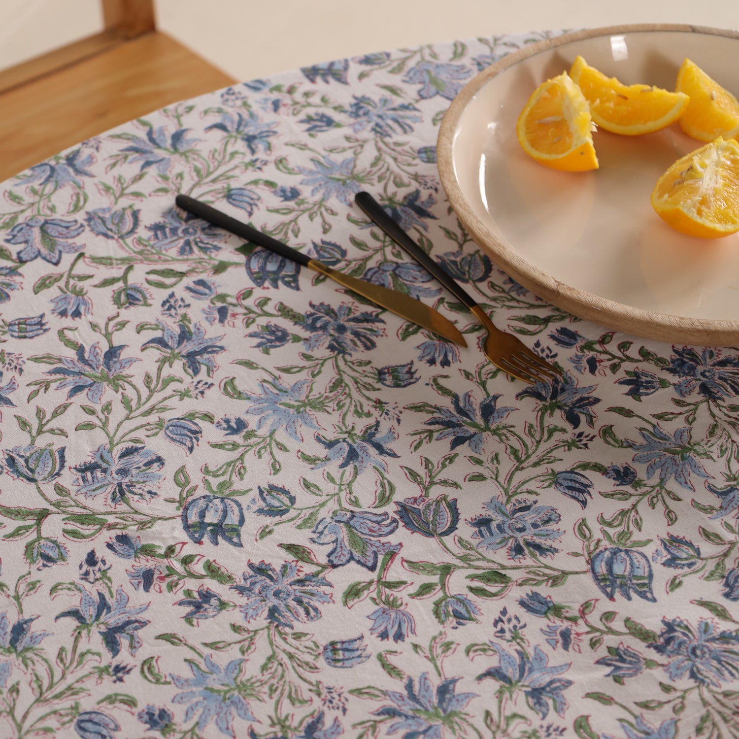 Runde Tischdecke aus Baumwolle mit indischem Blockdruck – Ranken in Weiß, Grün und Blau