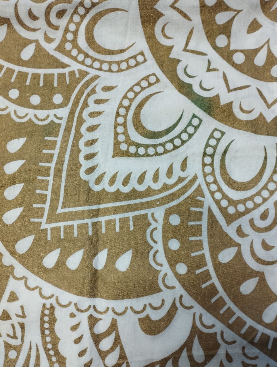 Weißer Goldvorhang mit Lotus Aufdruck. Leider ist der Goldaufdruck an einigen Stellen etwas hellblau verfärbt, wie auf dem zweiten Bild zu sehen. Ansonsten weist der Vorhang keine Fehler auf und ist in seiner Funktion nicht beeinträchtigt!