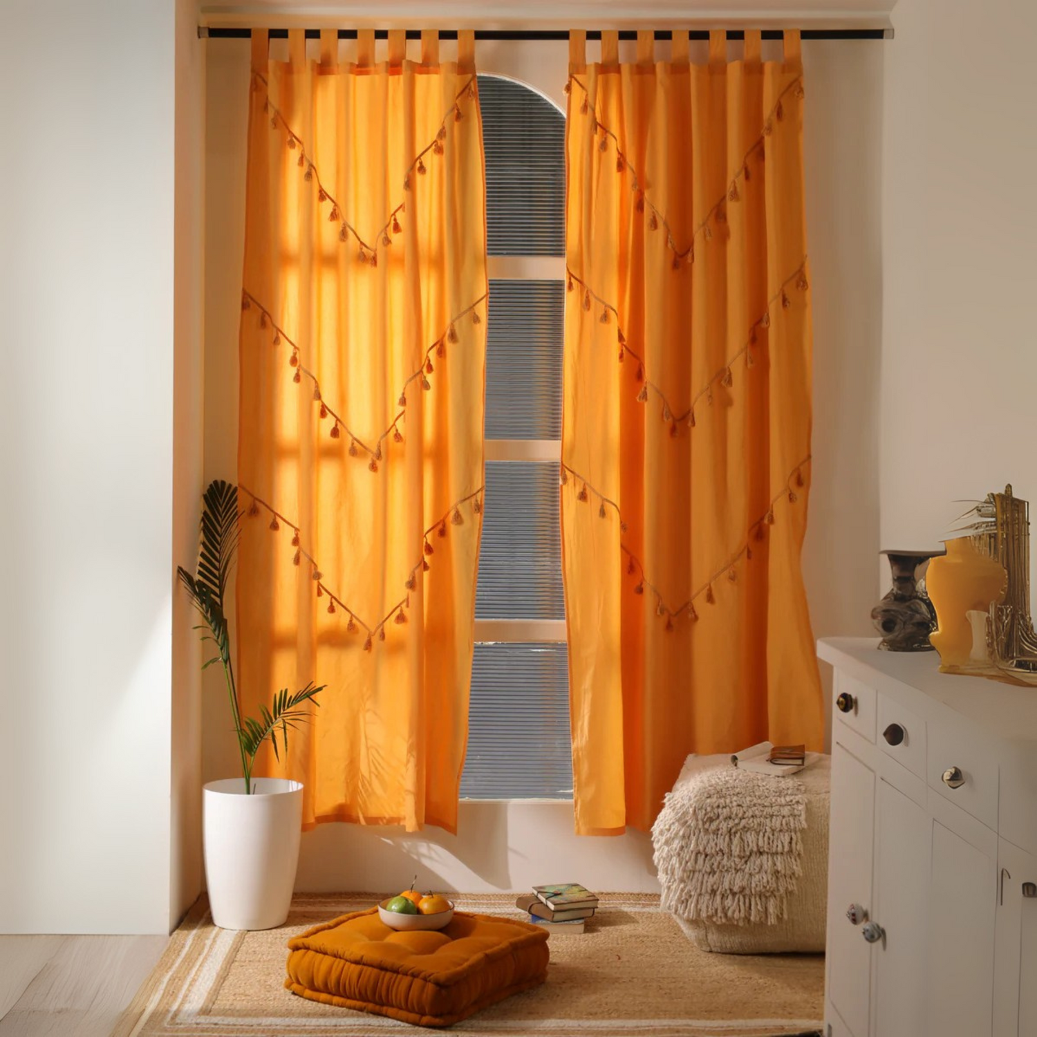 Strahle Wärme und Gemütlichkeit aus – mit diesem handgefertigten Boho Vorhang in Sonnengelb. Die fröhliche Farbe sorgt für eine lebendige, aber harmonische Atmosphäre, während die dekorativen Zierquasten den typischen Boho-Stil unterstreichen. Der leichte Baumwollstoff ist blickdicht und lichtdurchlässig, sodass er bei Sonnenschein ein wunderschönes Farbspiel in den Raum zaubert.