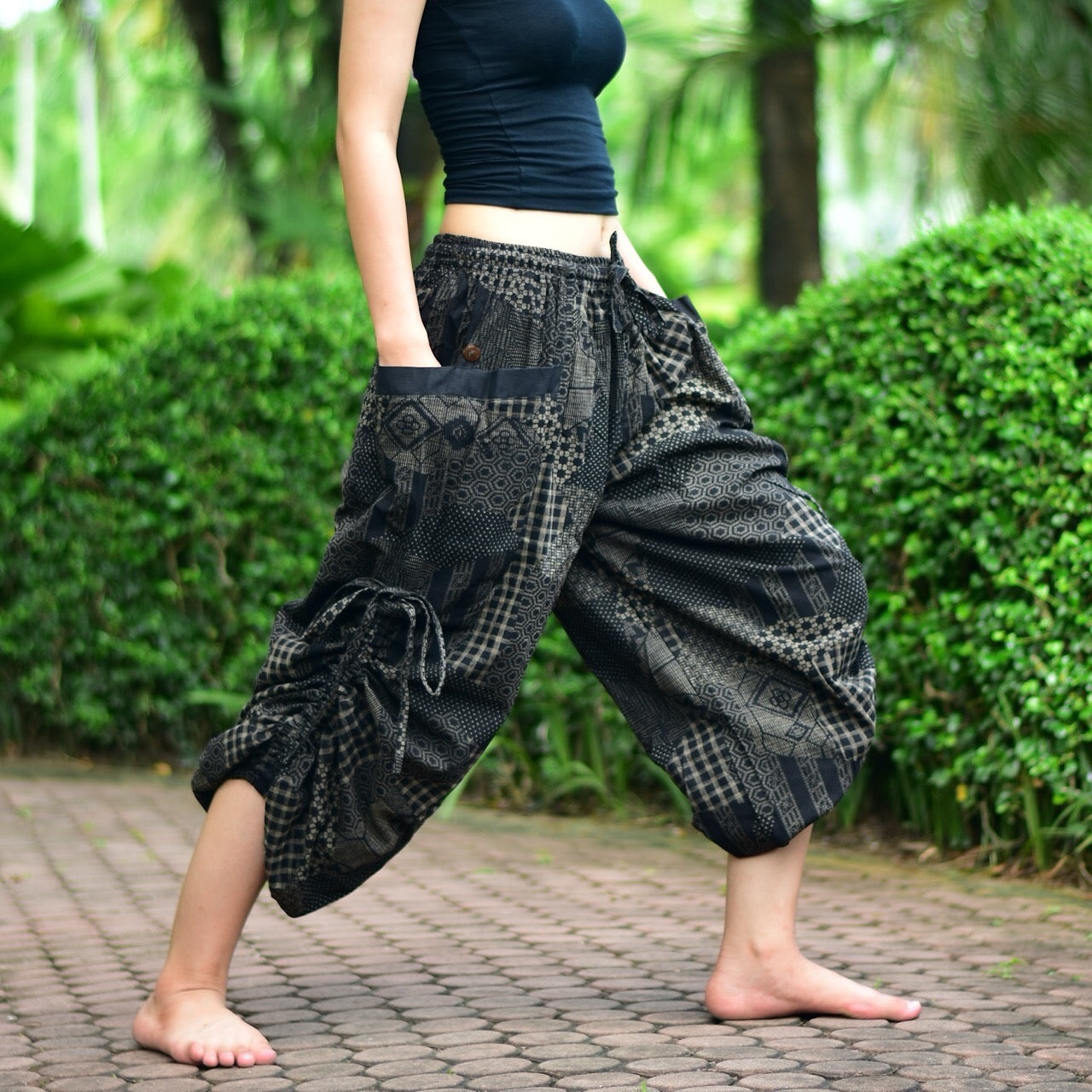 Super praktisch: Unterhalb der Taschen ist eine Kordel, welche mit dem Knöchelsaum verbunden ist. Dadurch kann die Goahose auch kurz in dreiviertel-Länge getragen werden.