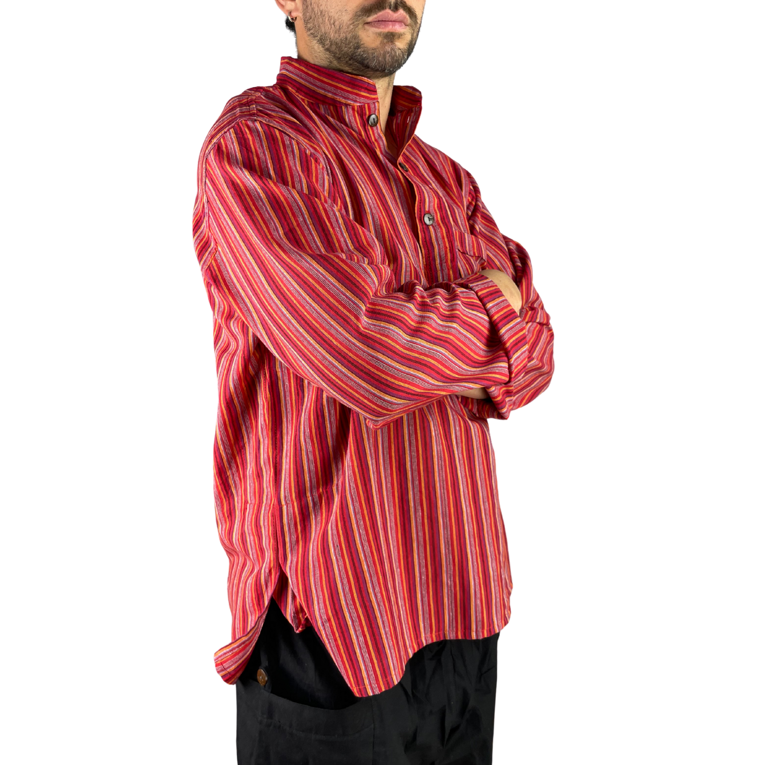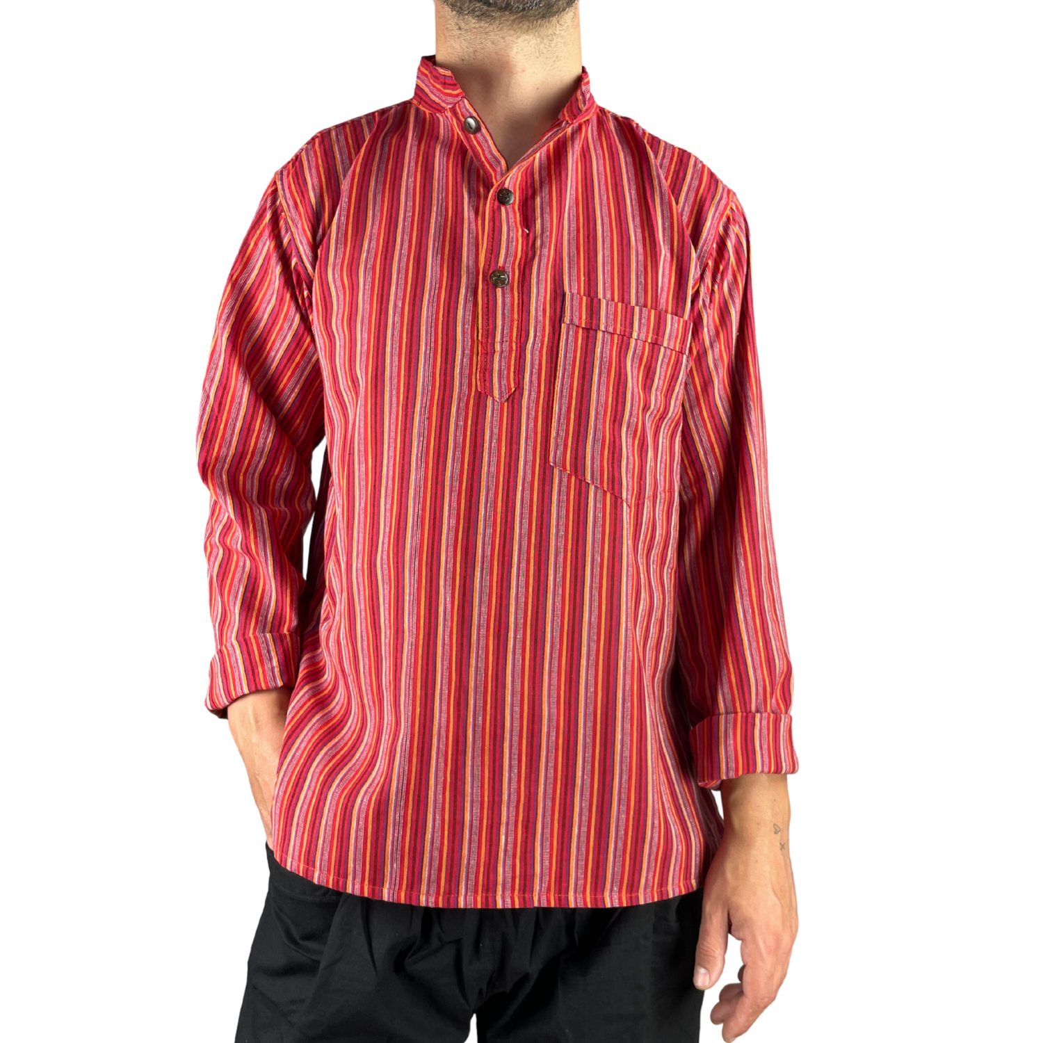 Dieses handgefertigte Hippie Hemd in Rot bringt Wärme, Energie und Boho-Flair in deinen Kleiderschrank. Das Streifenmuster in kräftigen Rottönen – ergänzt durch erdige Grau- und Naturfarben – erinnert an Sonnenuntergänge, Feuer und die farbenfrohe Tradition Nepals. Ein entspanntes Hemd für alle, die es gerne lebendig, individuell und besonders mögen.