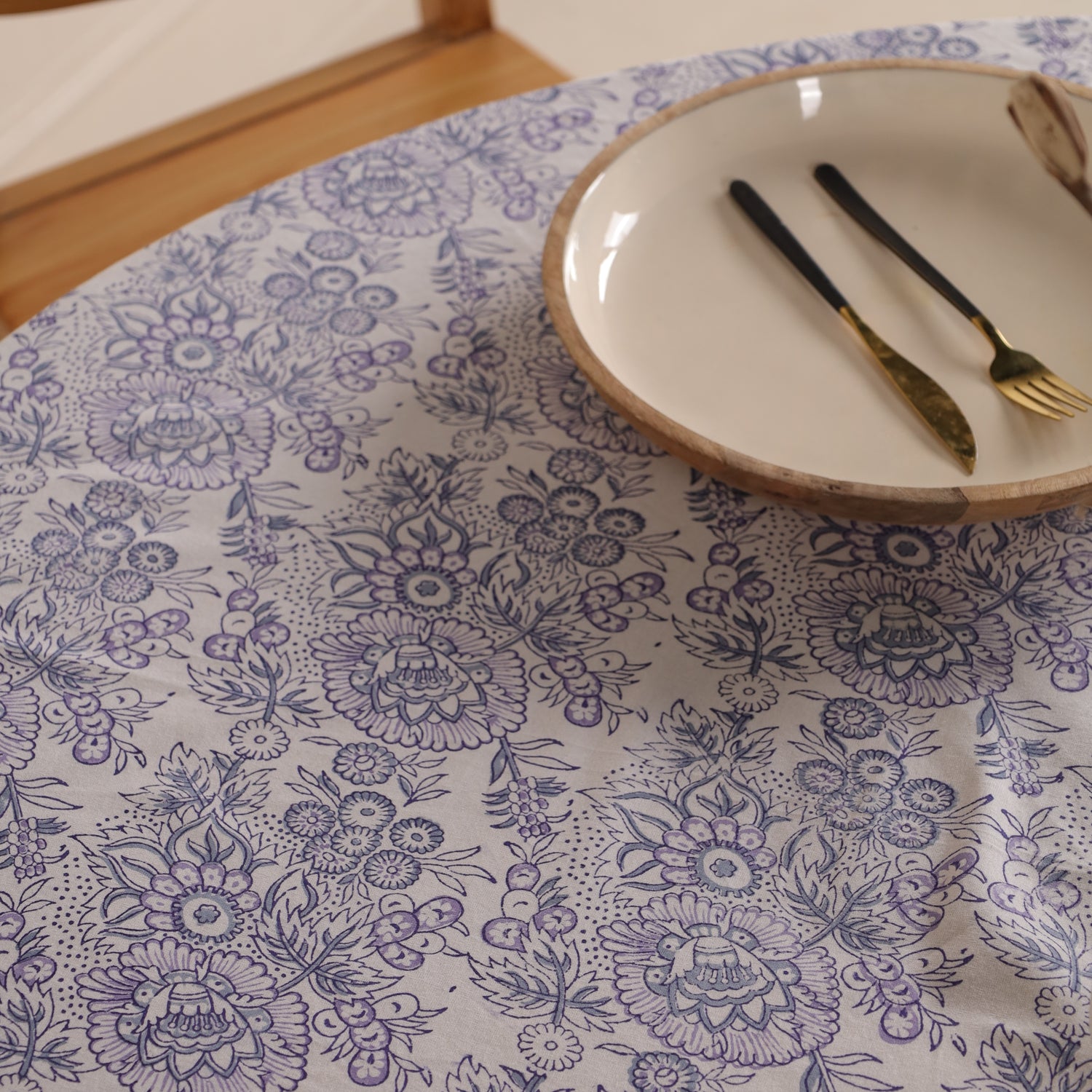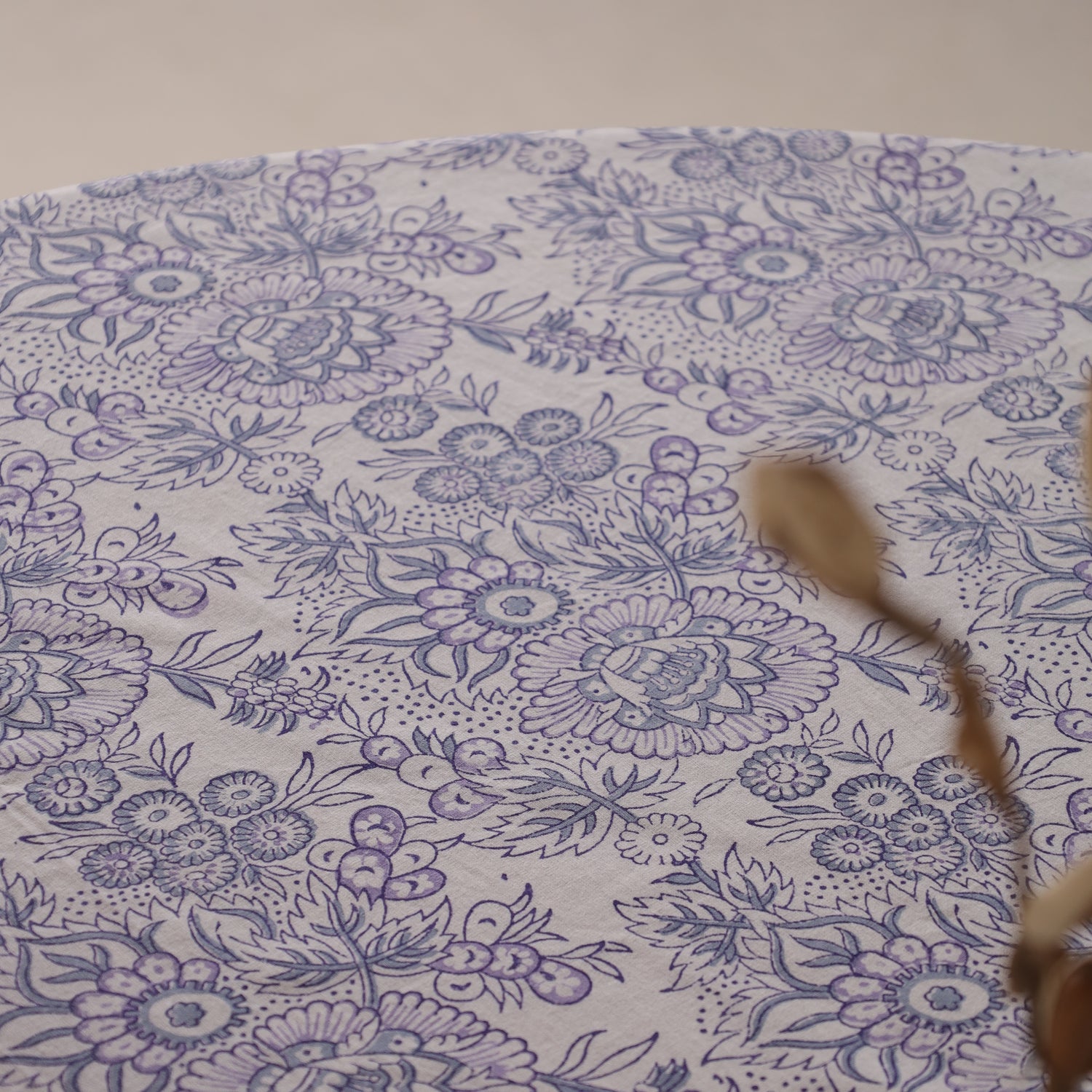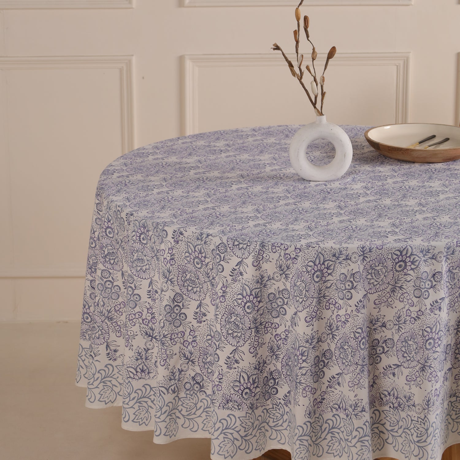 Runde Tischdecke aus Baumwolle mit indischem Blockdruck – Blumen in Weiß und Blau