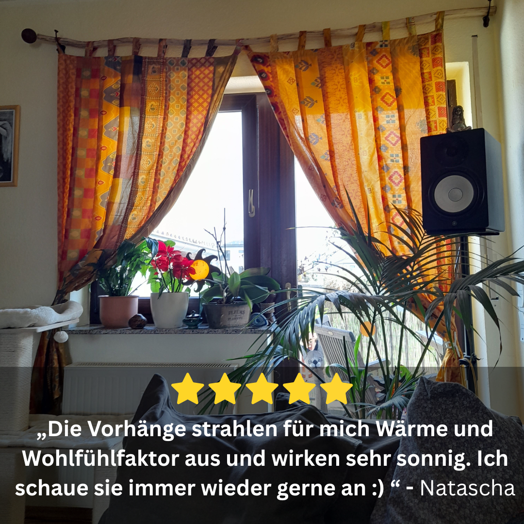 Diese Vorhänge entstehen aus recycelten Saris, die in Indien gesammelt und kunstvoll weiterverarbeitet werden. Dabei gibt es einen besonderen Brauch: Frauen tauschen ihre getragenen Saris nicht gegen Geld, sondern gegen Haushaltswaren oder Lebensmittel ein. So erhalten diese edlen Stoffe ein zweites Leben – und Du ein einzigartiges Stück indischer Handwerkskunst.