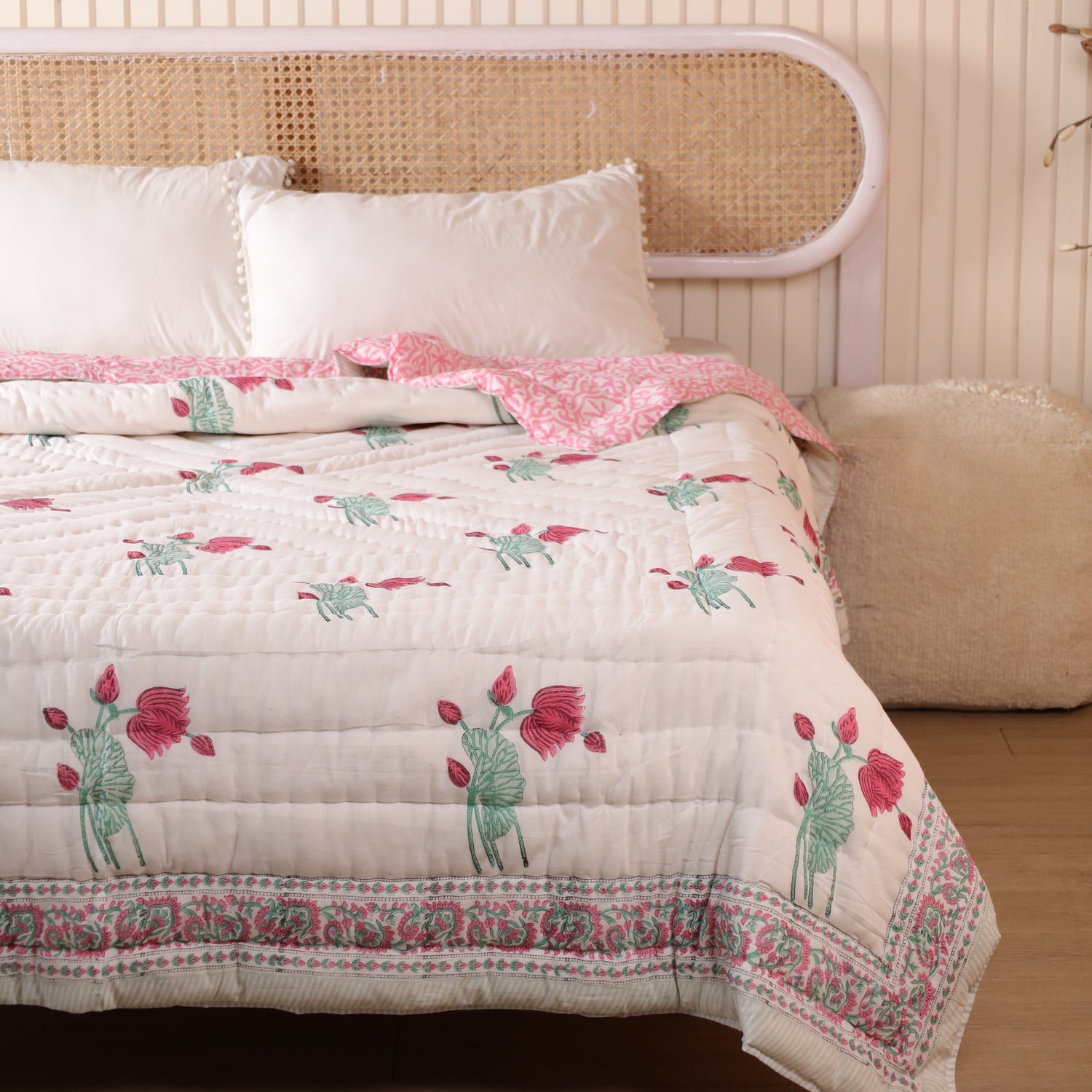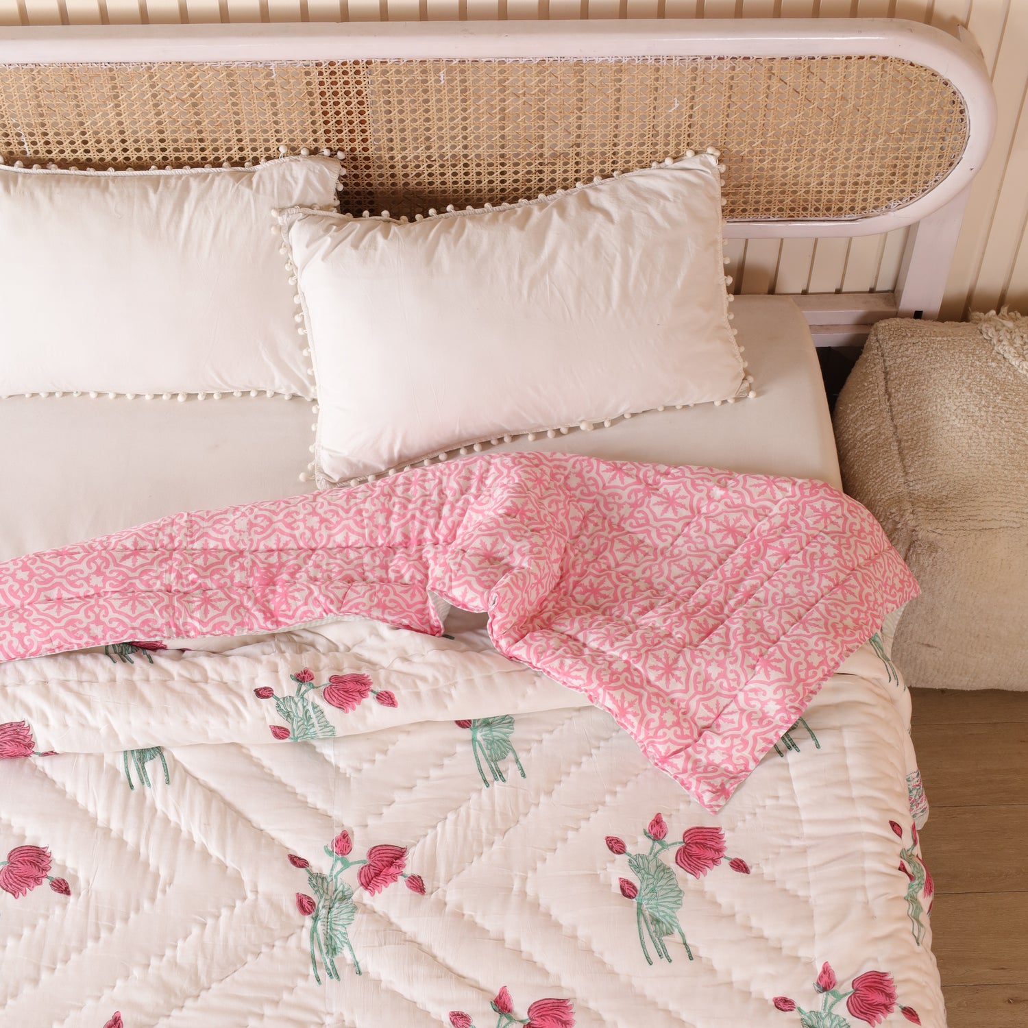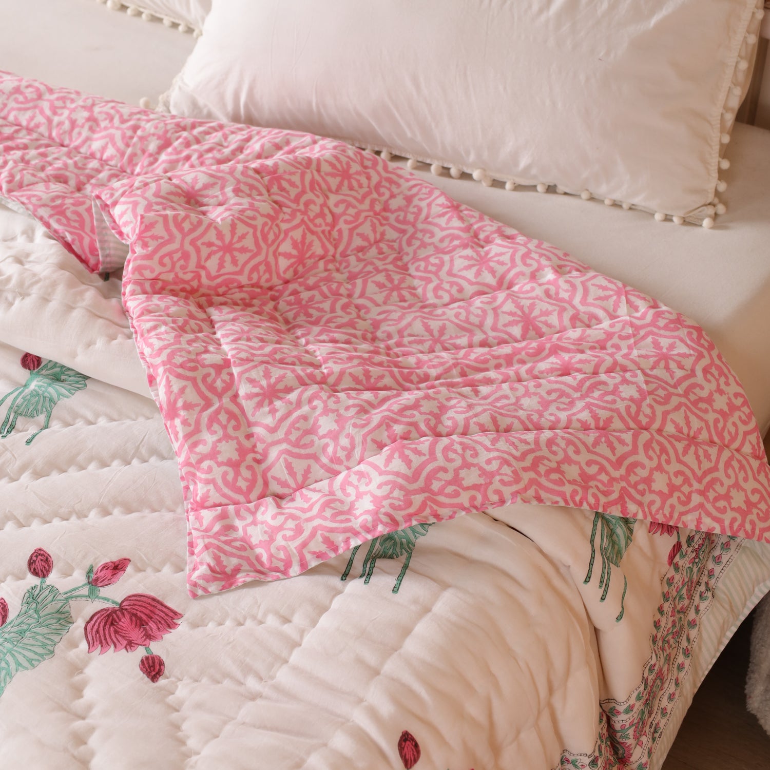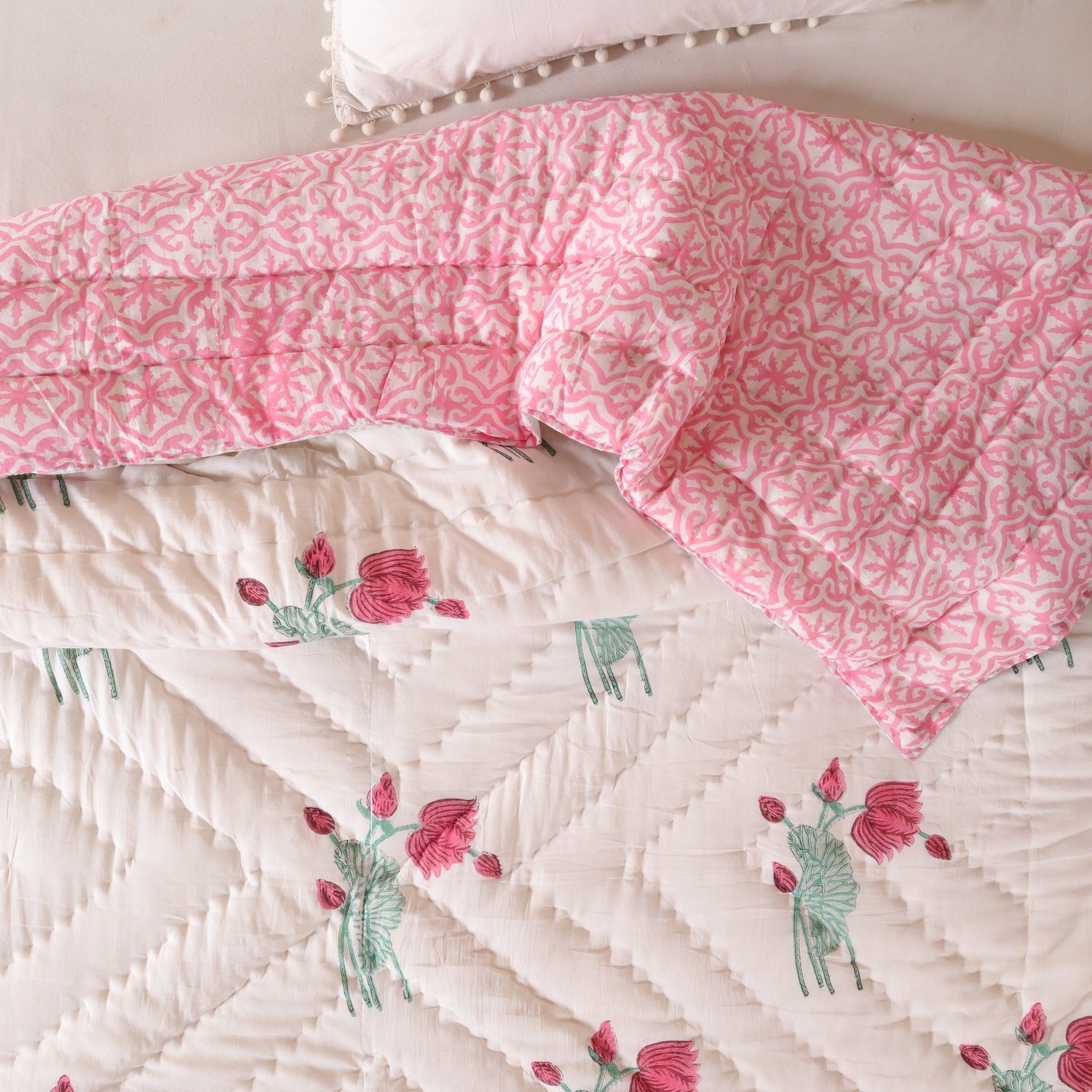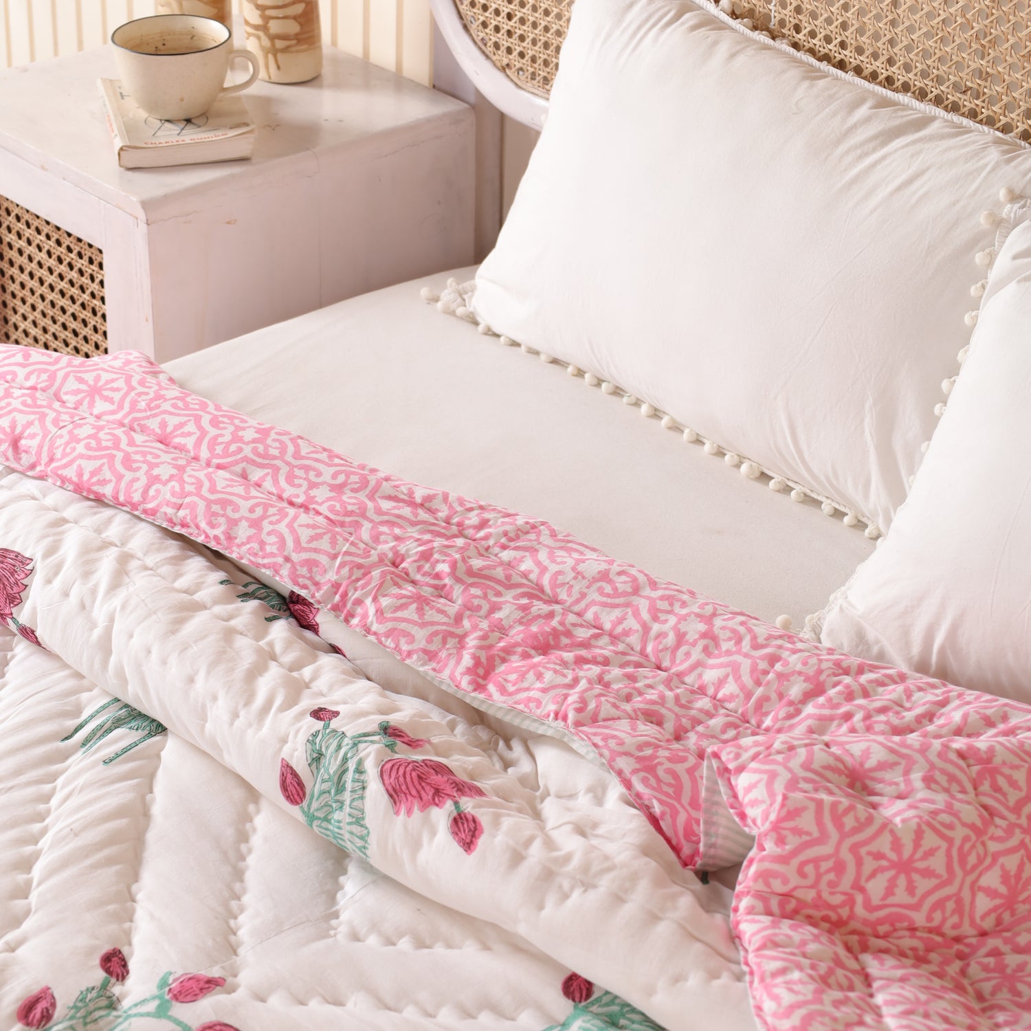 Die indische Tagesdecke Blumen Weiß Rosa bringt Leichtigkeit und romantischen Charme in dein Zuhause. Das helle Blumenmuster in Weiß und Rosa wirkt freundlich, einladend und harmonisch – perfekt als Bettüberwurf, Boho Decke oder dekorative Sommerdecke.