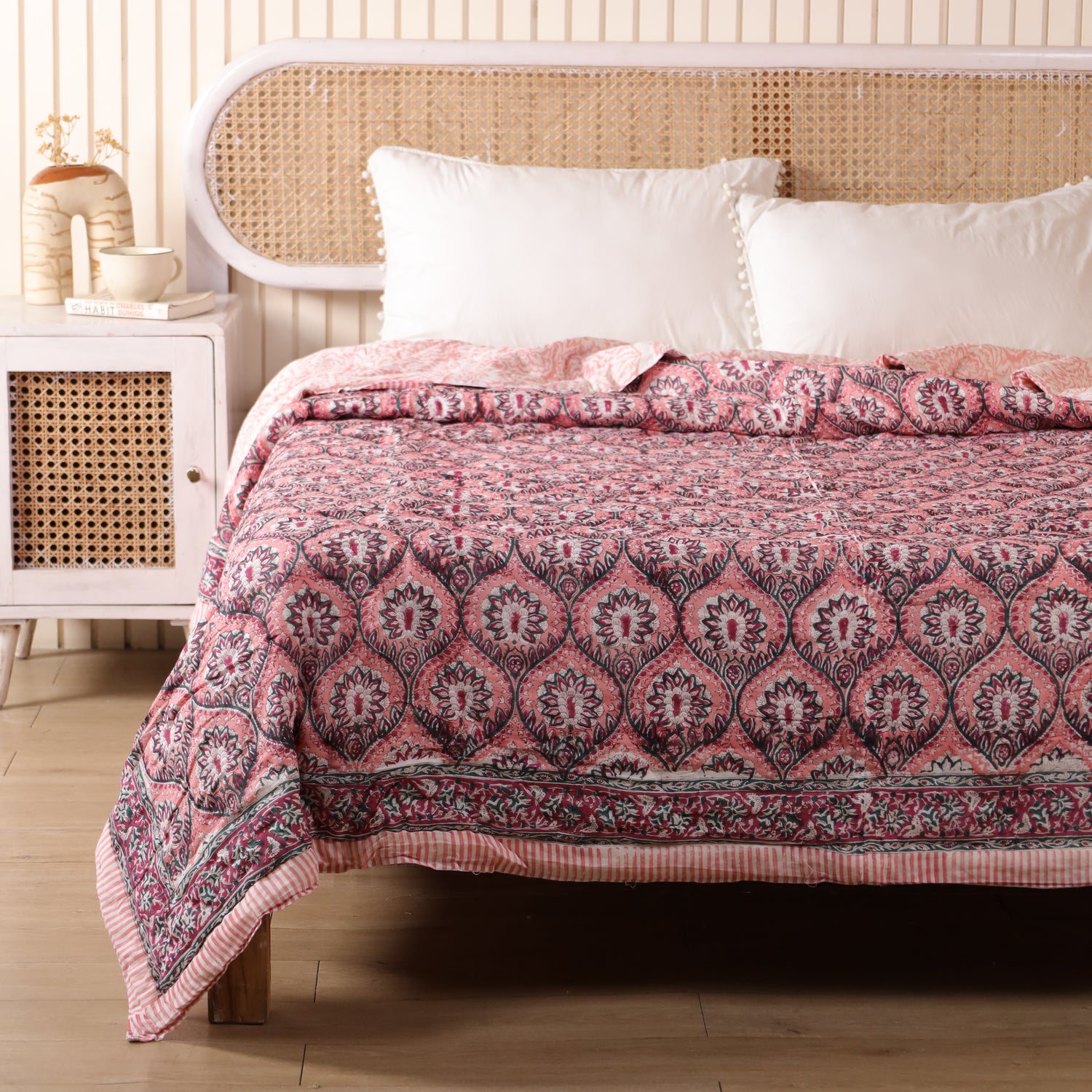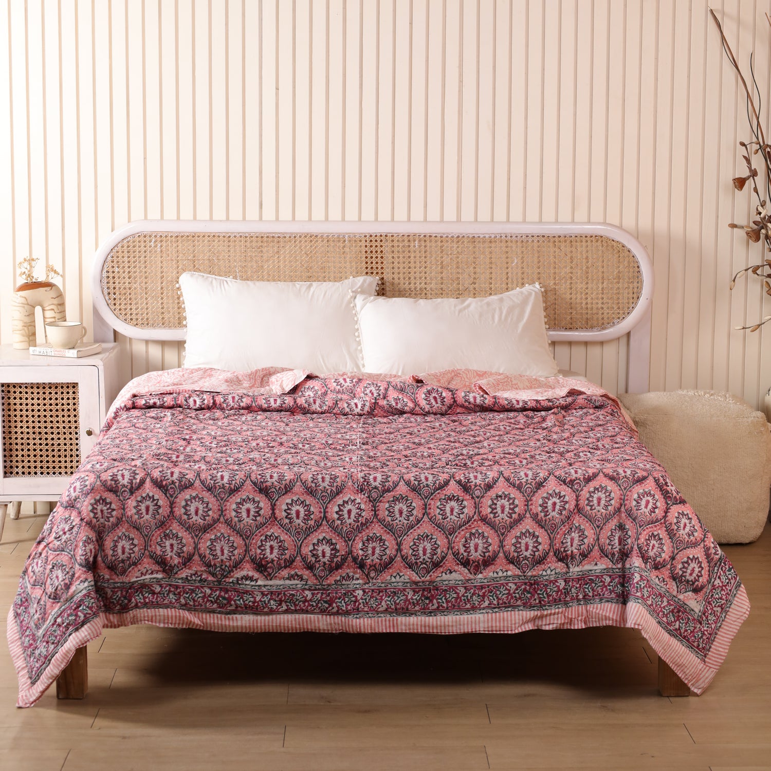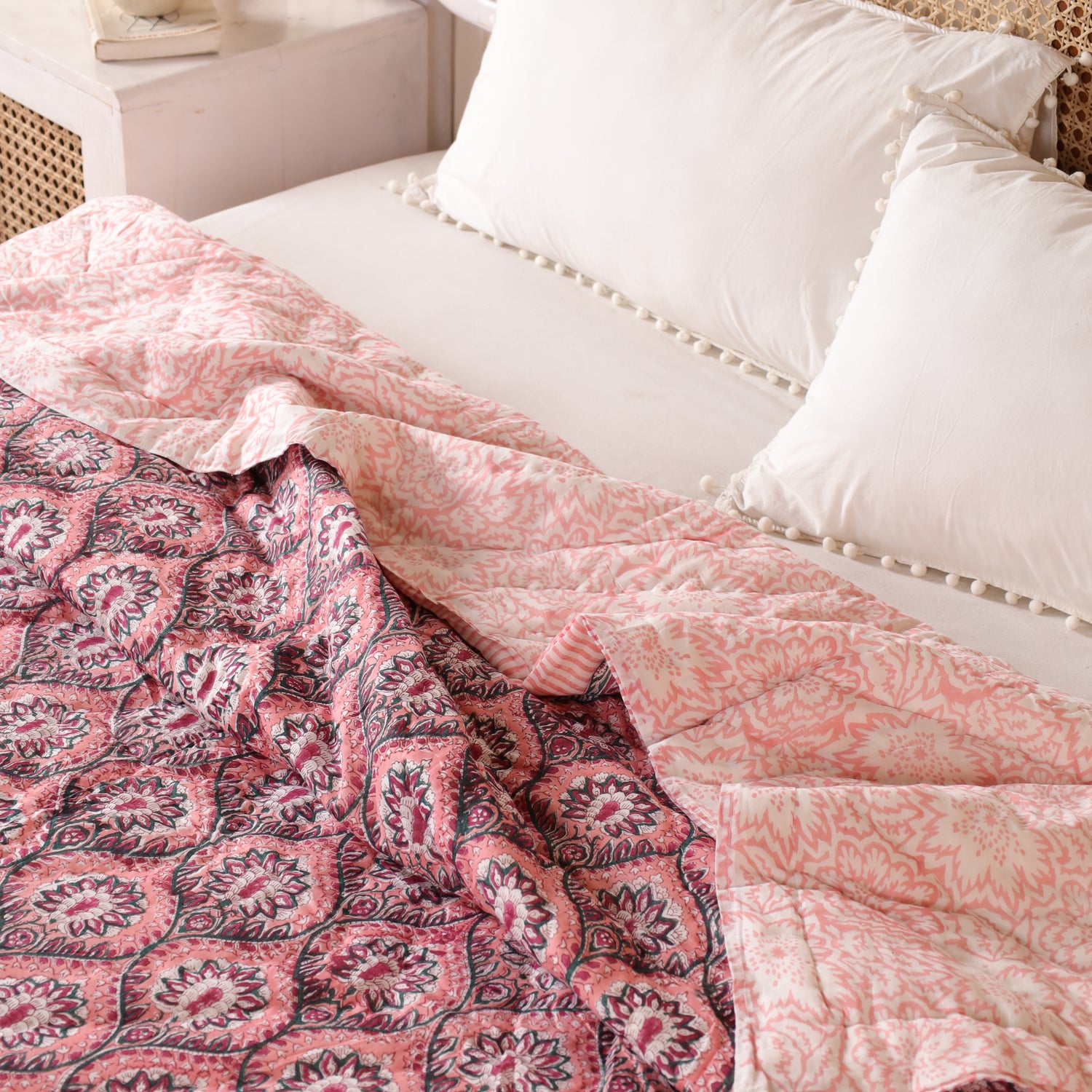 Die indische Tagesdecke Mosaik Rosa besticht durch ihr zartes Mosaikmuster in Rosatönen. Sie bringt Wärme, Leichtigkeit und eine feminine Eleganz in dein Zuhause. Ob als Bettüberwurf, dekorative Boho Decke oder leichte Sommerdecke – diese handgefertigte Decke ist ein stilvoller Begleiter für gemütliche Momente.