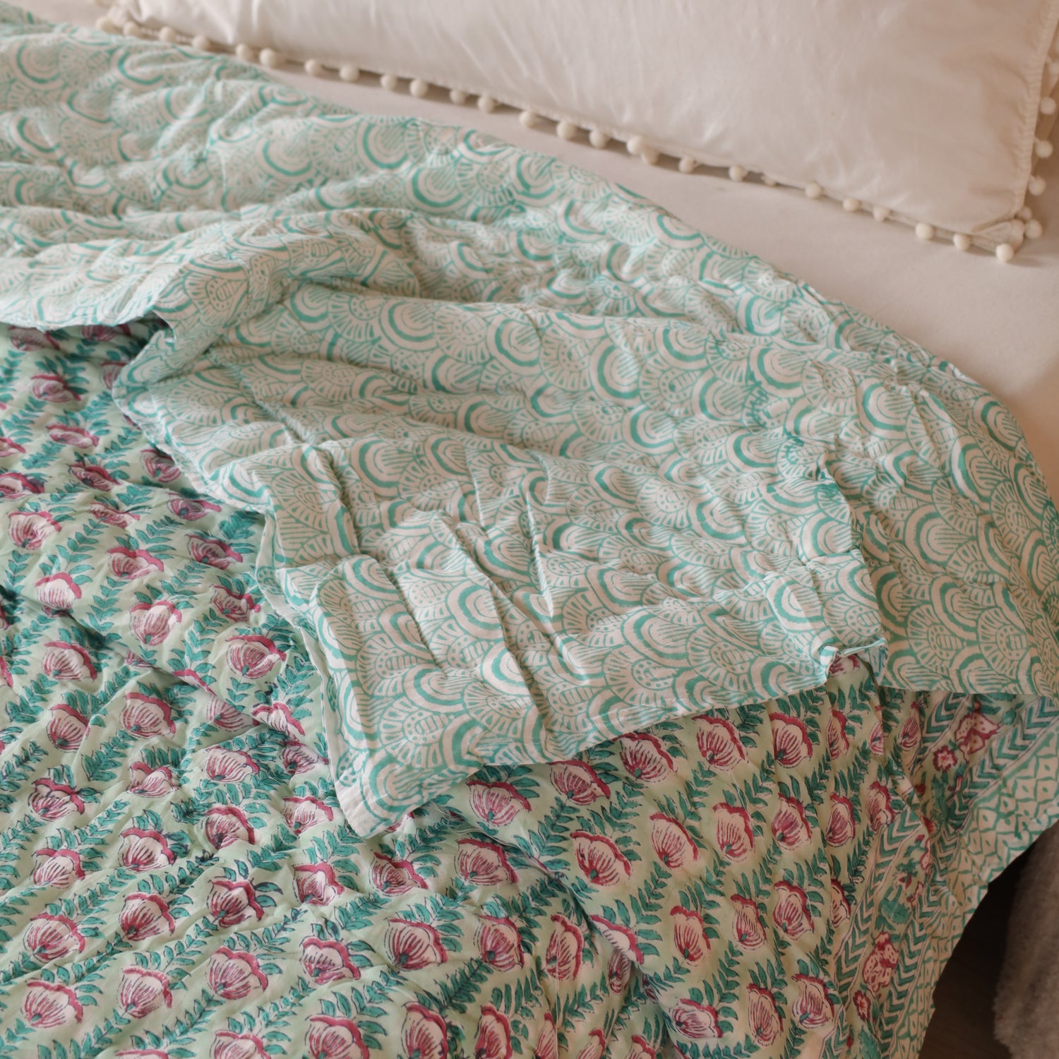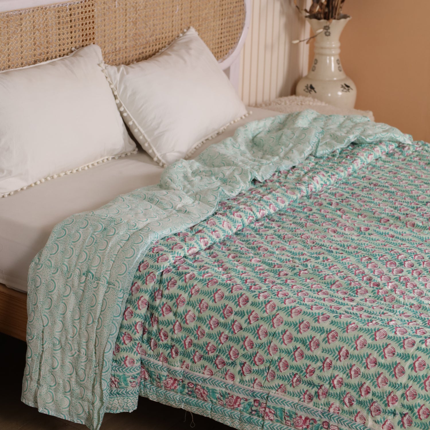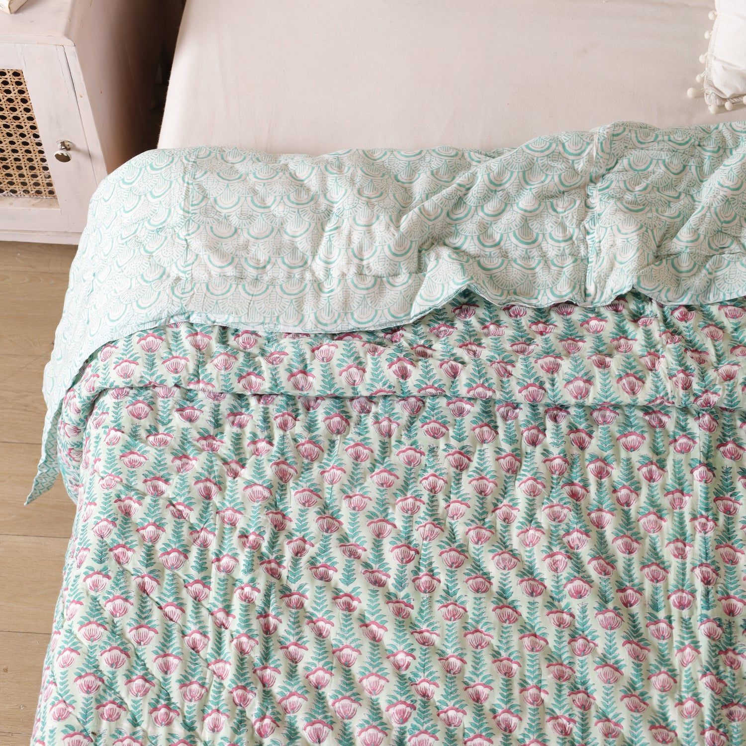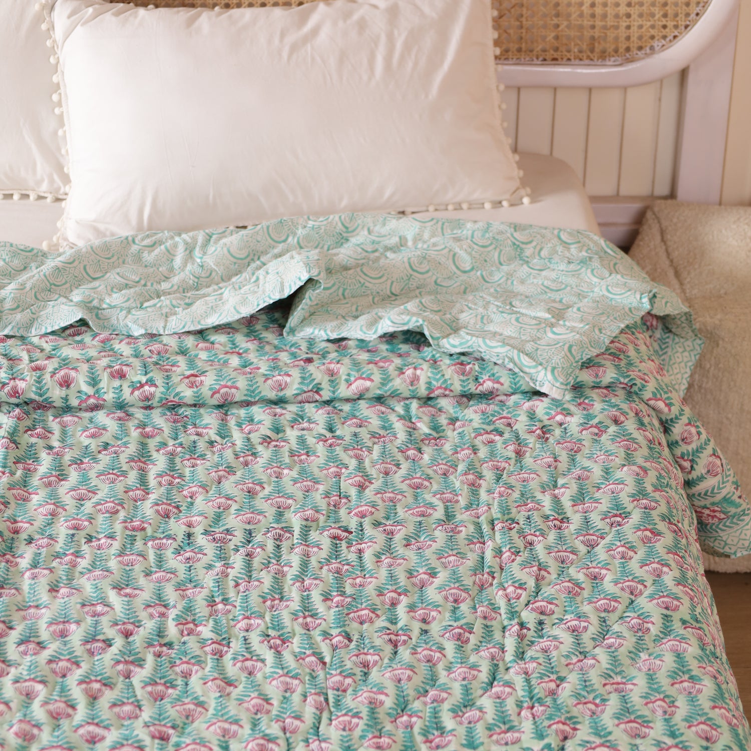 Diese indische Tagesdecke Blumen Türkis Rosa vereint kunstvolles Blockdruck-Design mit einer harmonischen Farbkombination. Das florale Muster bringt Frische, Leichtigkeit und eine verspielte Note in jeden Raum. Ob als Bettüberwurf, gemütliche Kuscheldecke oder stilvolle Boho Decke – sie setzt farbenfrohe Akzente und schafft Wohlfühlatmosphäre.
