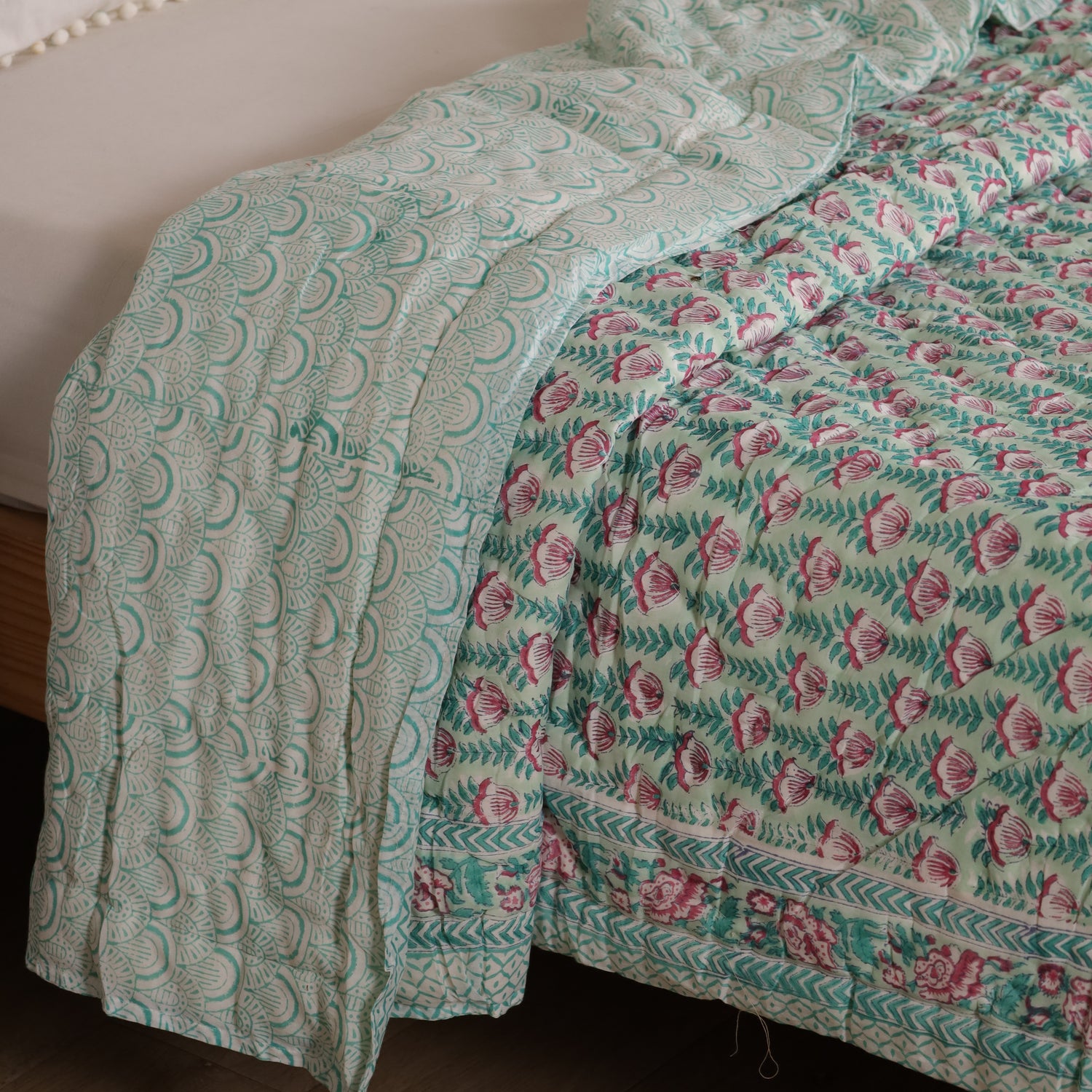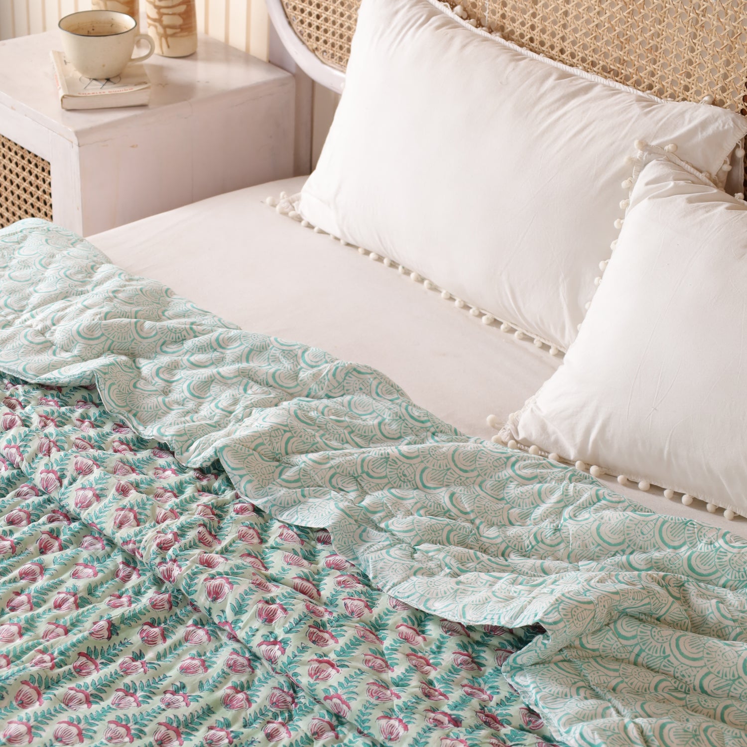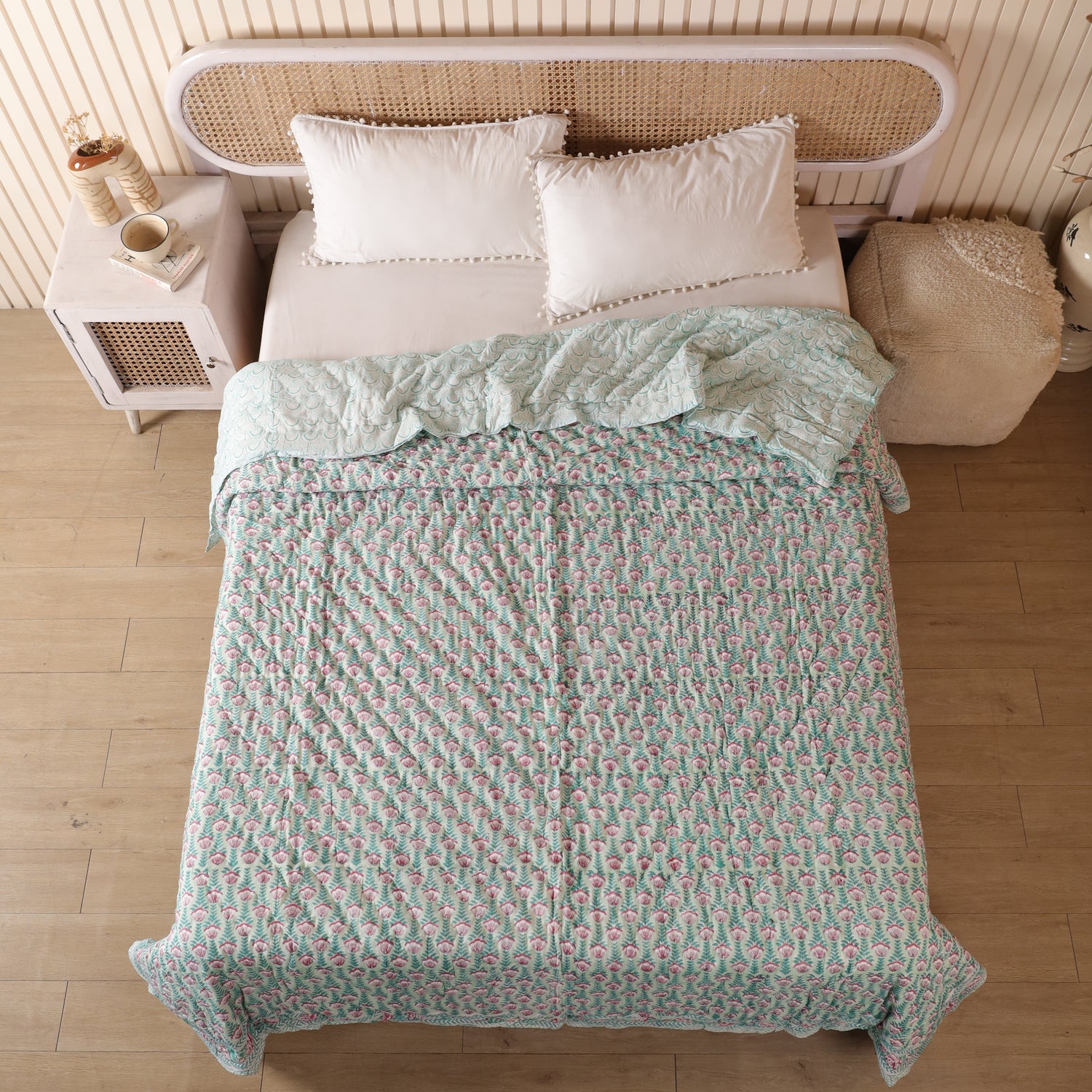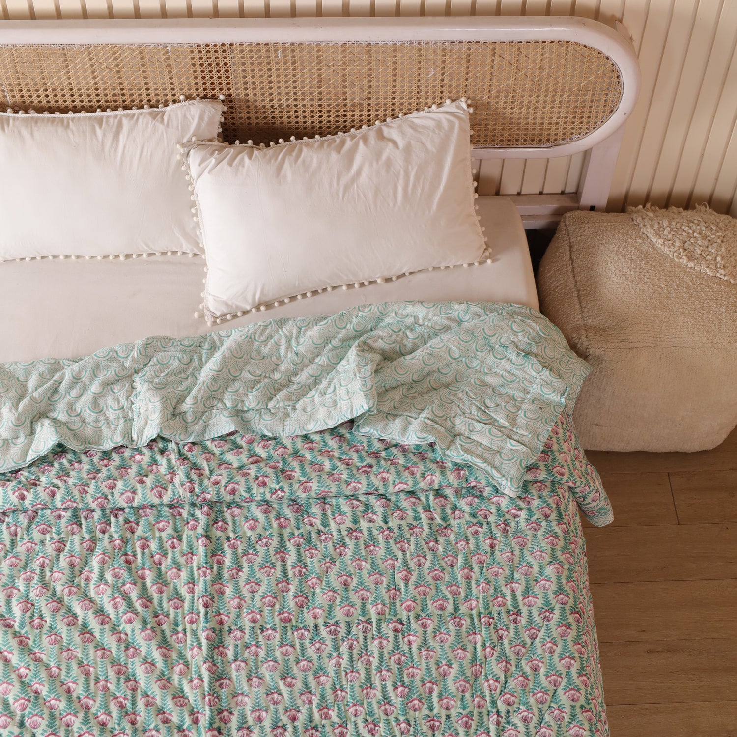 Diese indische Tagesdecke Blumen Türkis Rosa vereint kunstvolles Blockdruck-Design mit einer harmonischen Farbkombination. Das florale Muster bringt Frische, Leichtigkeit und eine verspielte Note in jeden Raum. Ob als Bettüberwurf, gemütliche Kuscheldecke oder stilvolle Boho Decke – sie setzt farbenfrohe Akzente und schafft Wohlfühlatmosphäre.