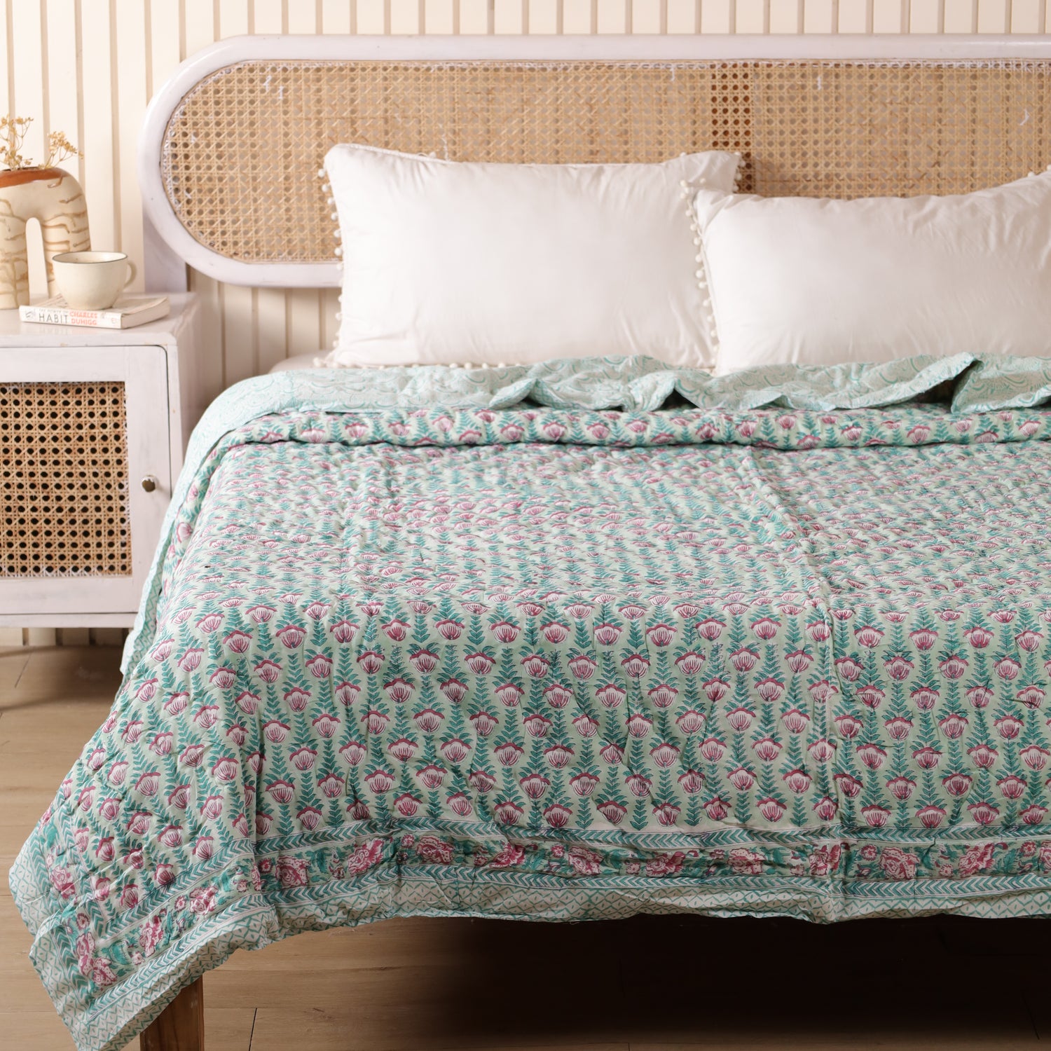 Die Decke besteht komplett aus 100% Baumwolle – hautfreundlich, atmungsaktiv und langlebig. Durch die sorgfältige Hand-Steppung erhält sie ihre Strapazierfähigkeit und die typische Struktur. So entsteht eine hochwertige indische Steppdecke, die Schönheit, Funktion und Nachhaltigkeit perfekt verbindet.