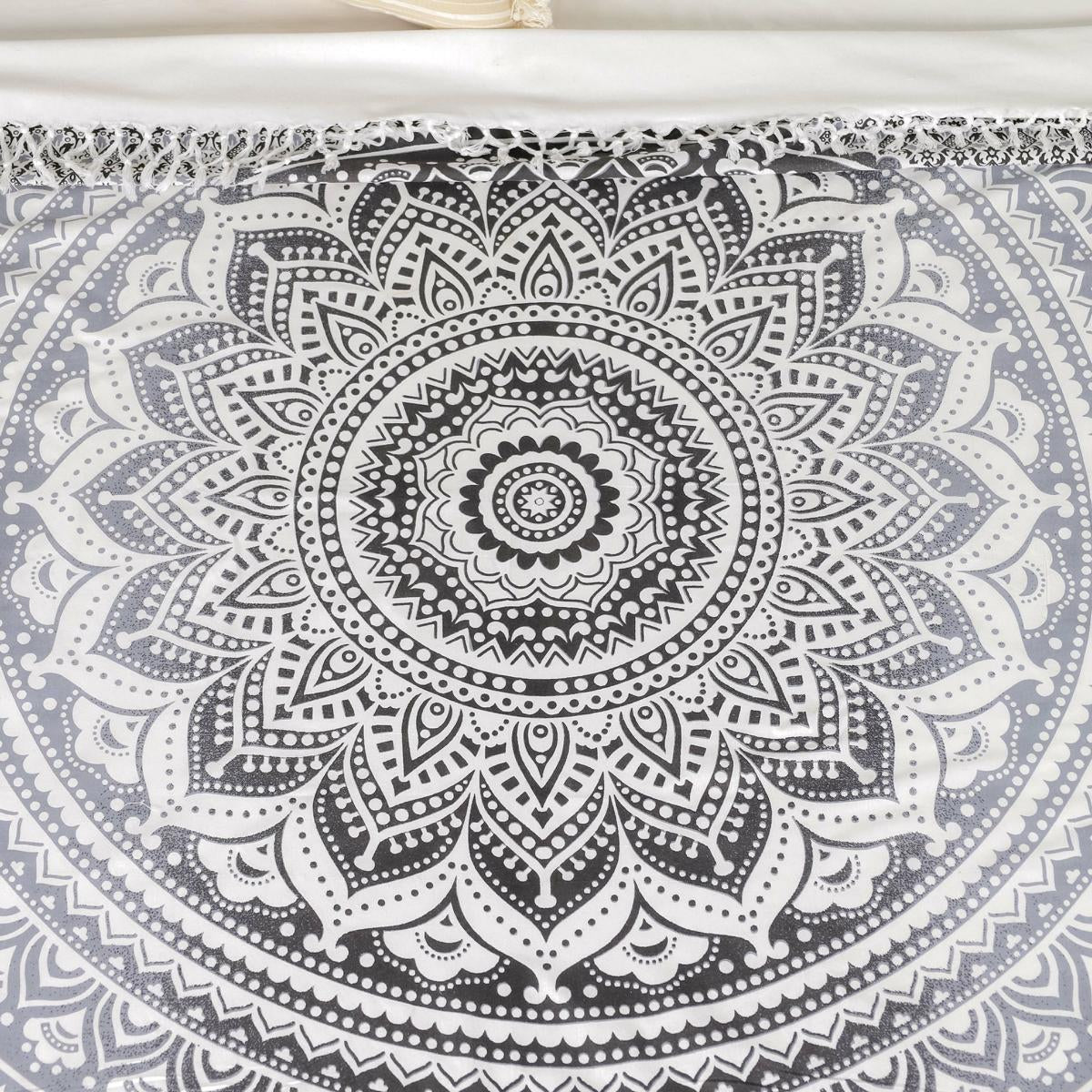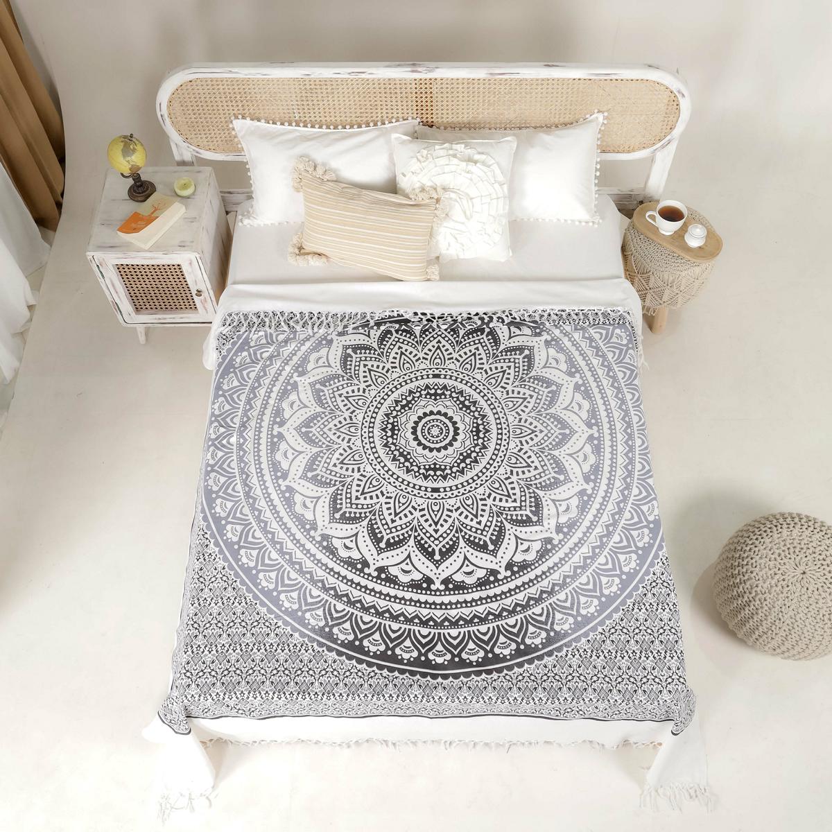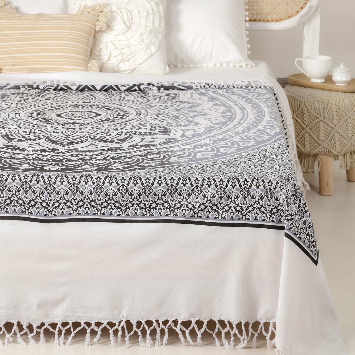 Indische Mandala Tagesdecke mit einem Farbverlauf von einem leichten grau in ein kräftiges schwarz auf einem Untergrund in naturweiß.