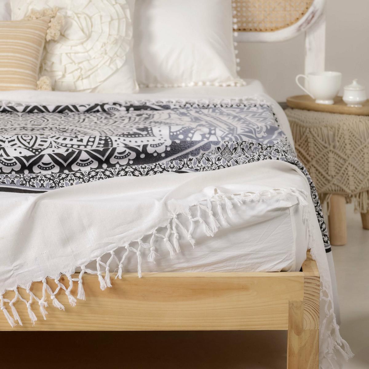 Ebenso verfügt die große Mandala Decke über geknotete Zierfransen an zwei Seiten, welche das Möbelstück, ob Bett oder Sofa, zusätzlich verzieren.