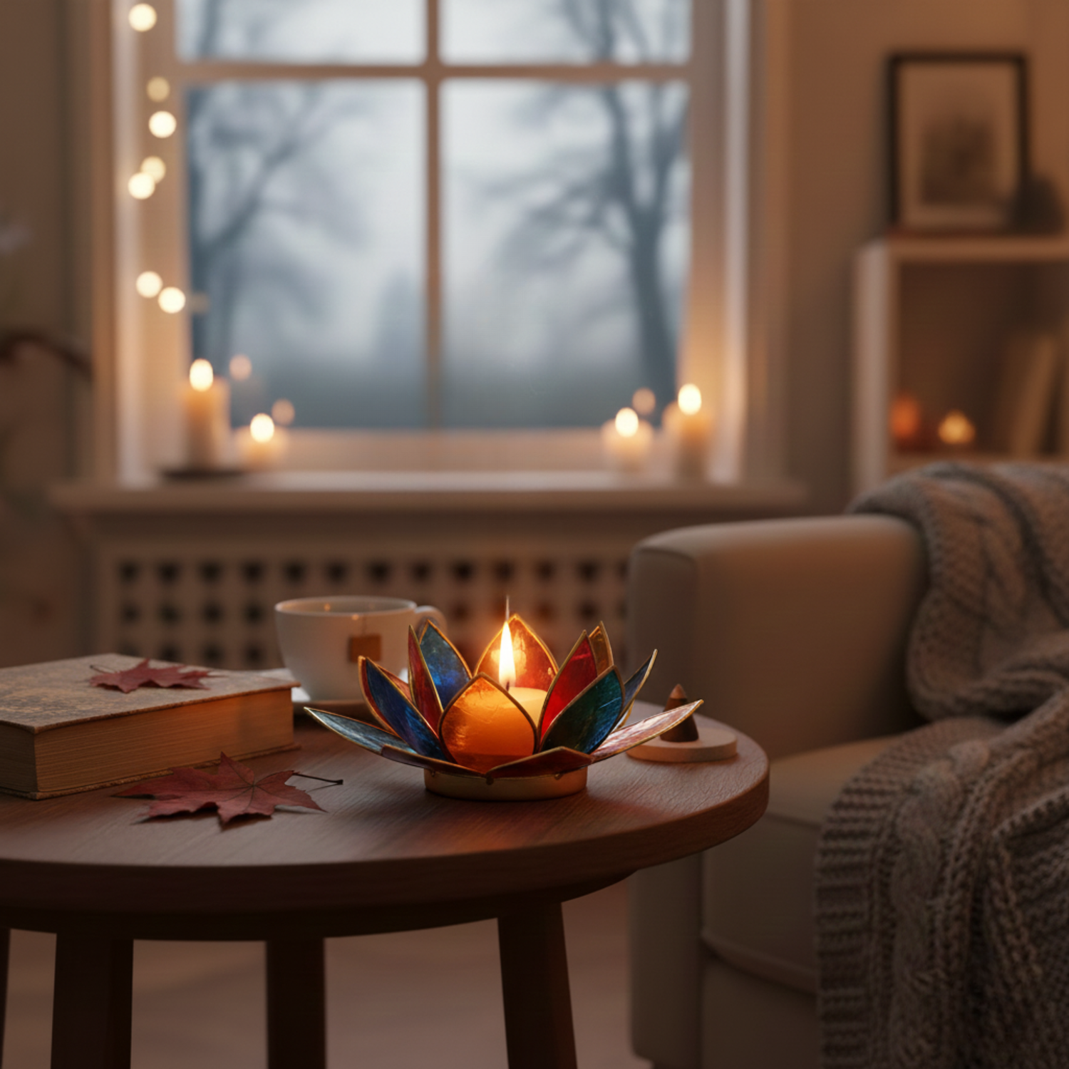 Teelichthalter mit Lotusmotiv – In den Farben der 7 Chakren